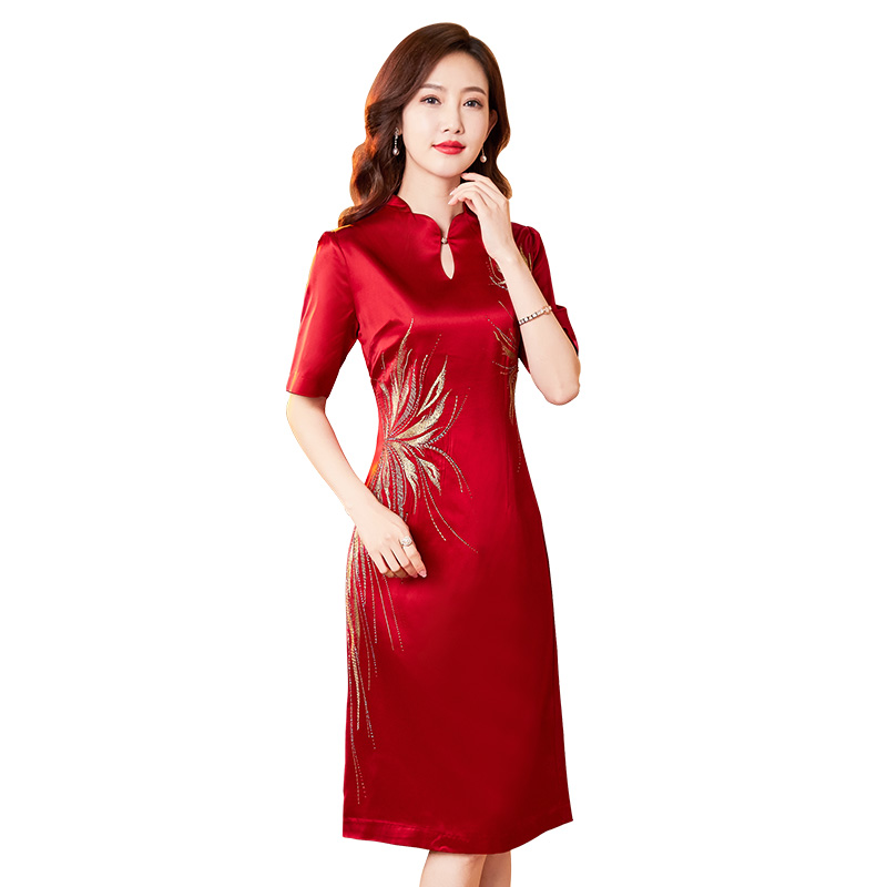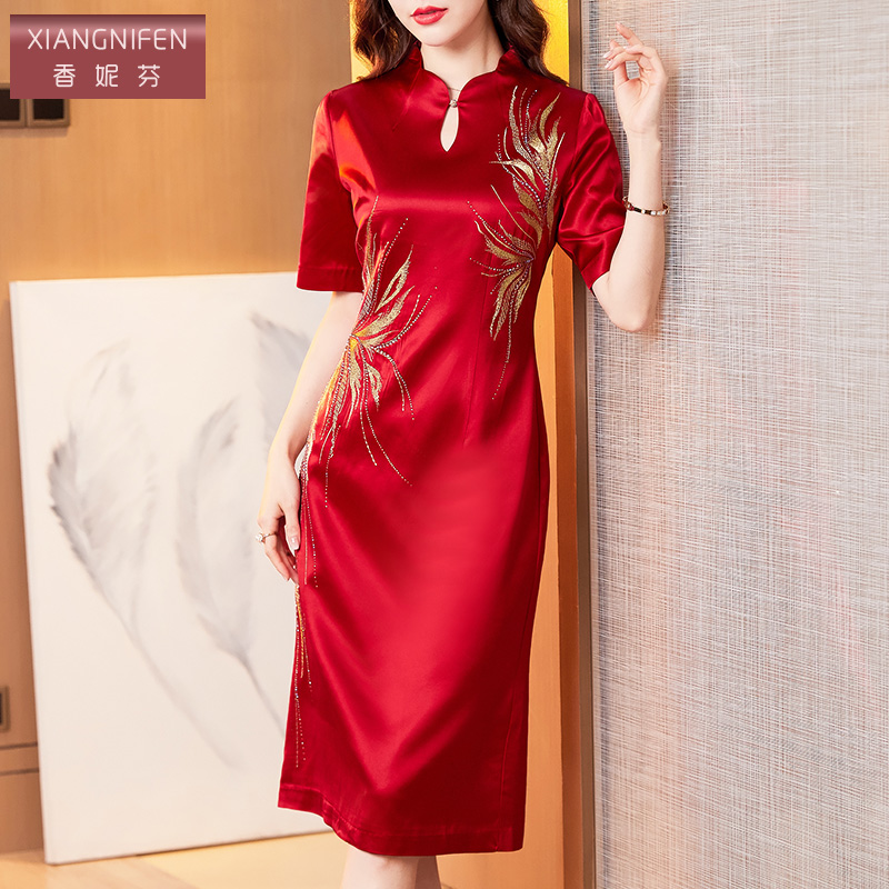 香妮芬2025秋季新款醋酸材质妈妈婚宴礼服连衣裙高端精致喜婆婆装