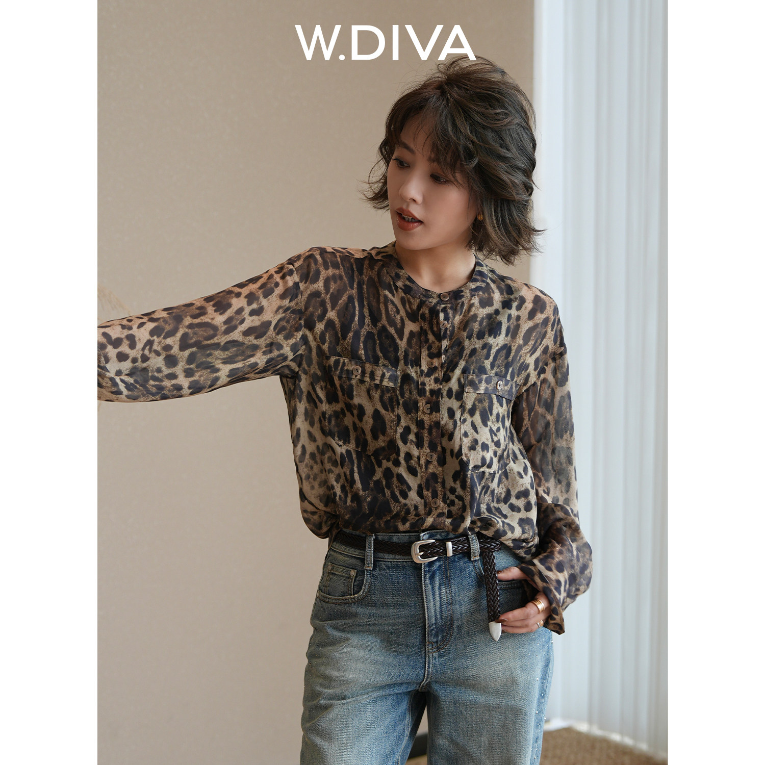 魏老板W.Diva 复古豹纹桑蚕丝长袖衬衫女2026年新款春装衬衣上衣
