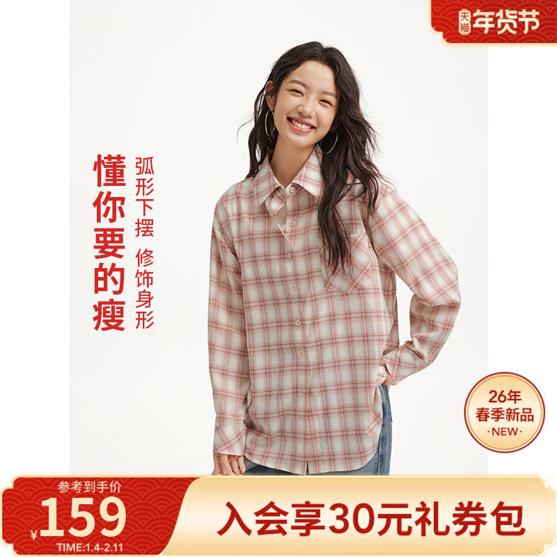 热风2026年春季新款女士休闲肌理格纹衬衫面料挺括复古撞色