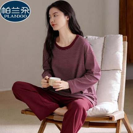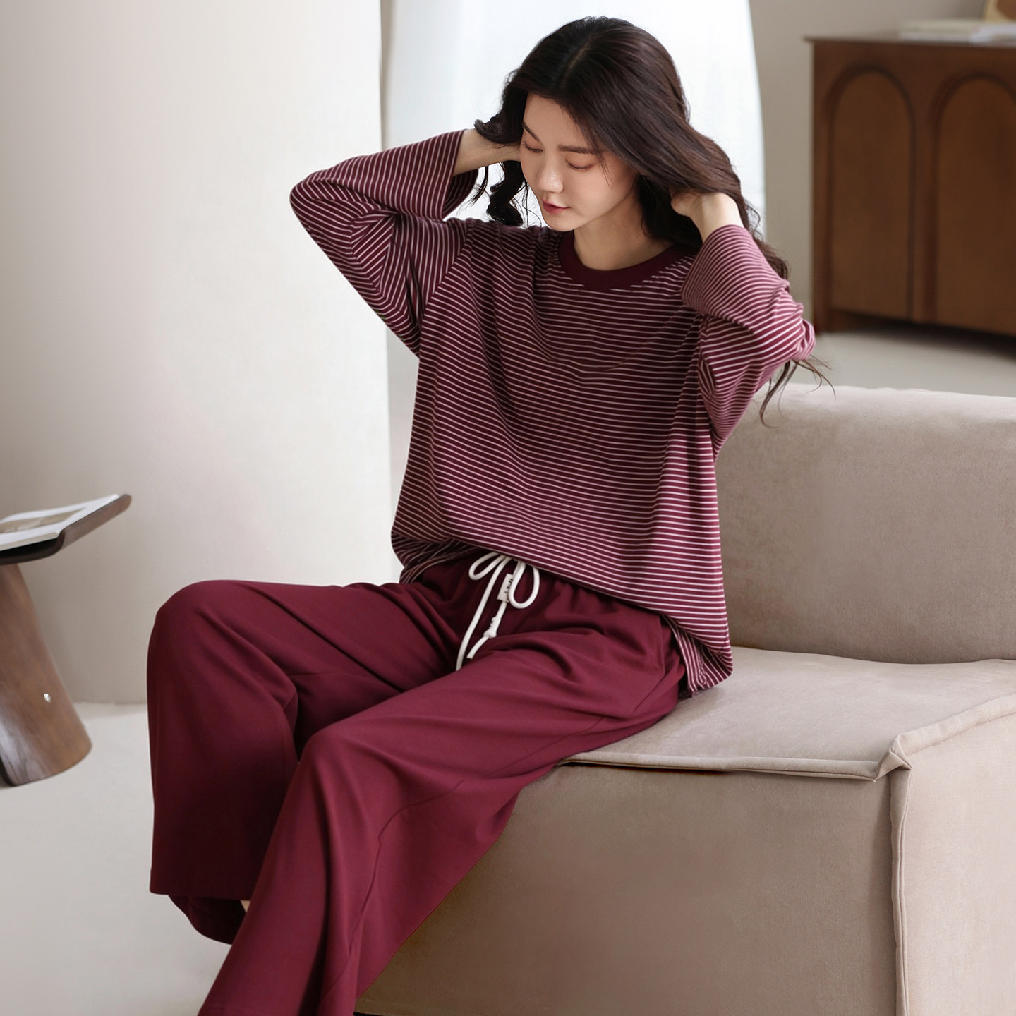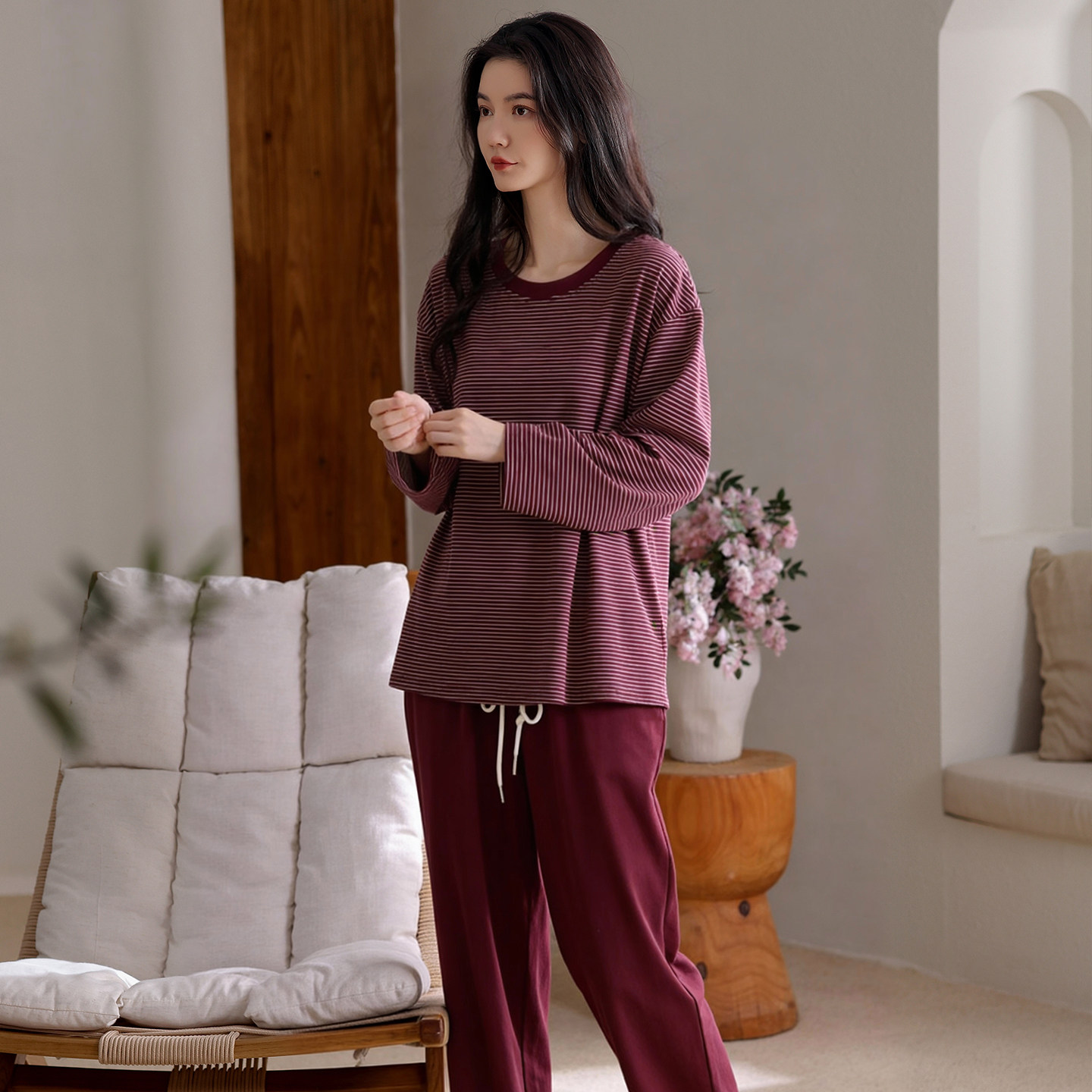 2026新款纯棉睡衣女士春秋季天全棉长袖酒红色条纹休闲家居服套装