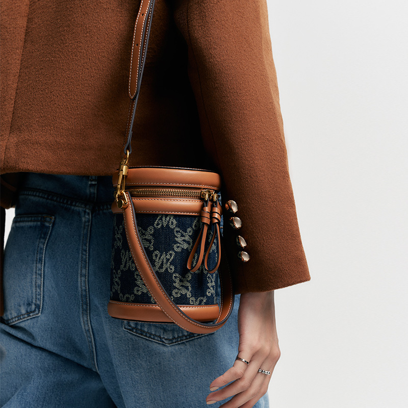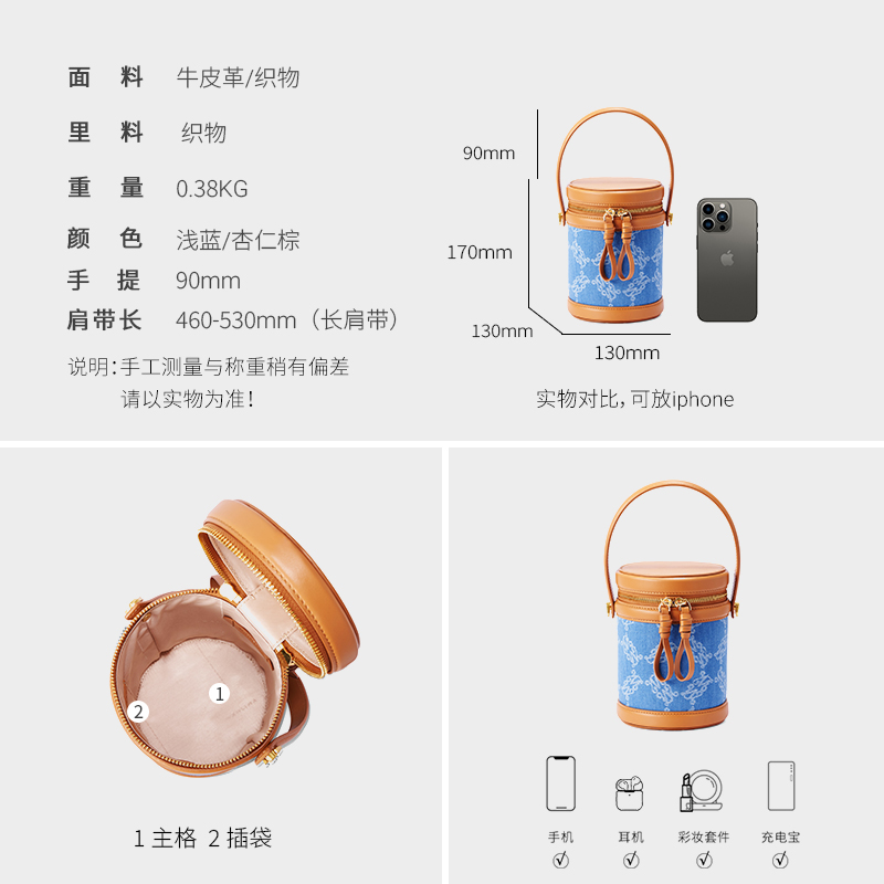 万里马丹宁手提发财桶水桶包女单肩斜挎迷你牛仔圆筒包便携化妆包