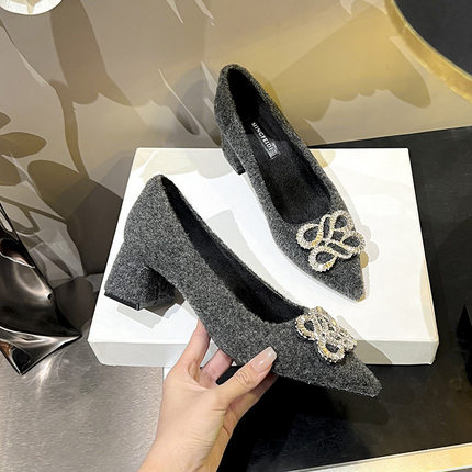 2025新款法式水钻方扣尖头单鞋女高跟鞋加绒时尚中跟粗跟工作鞋