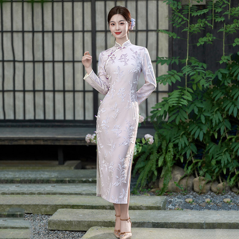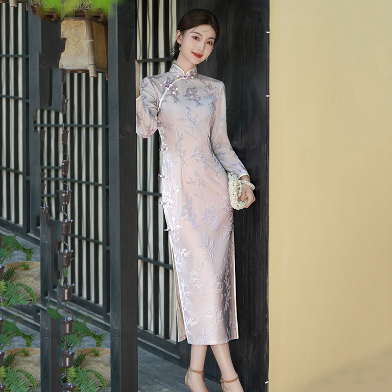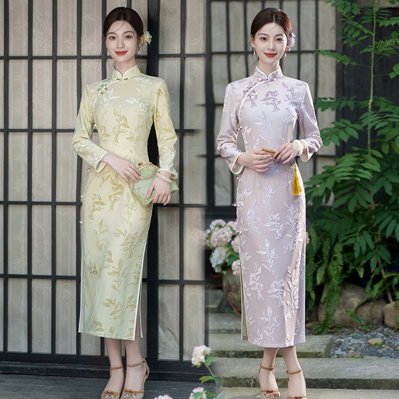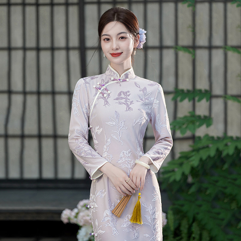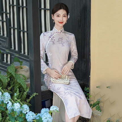 紫色绿色国风中式长款秋季长袖旗袍改良年轻款女复古修身收腰秋冬
