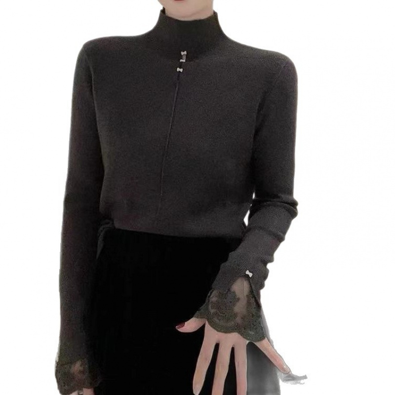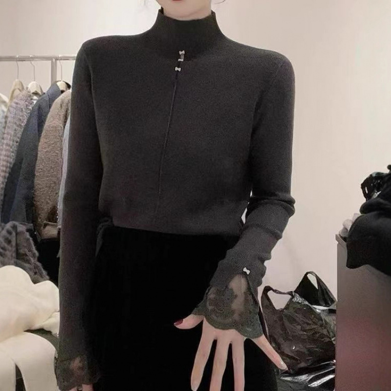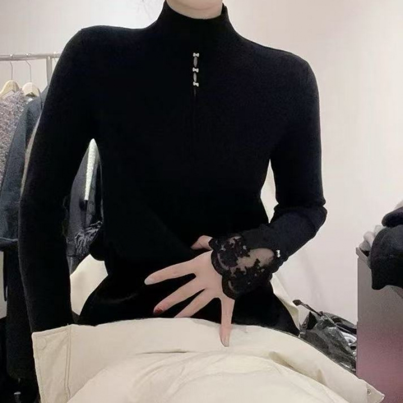 2025秋季新款时尚设计感高领长袖打底衫修身显瘦拼接蕾丝女装上衣