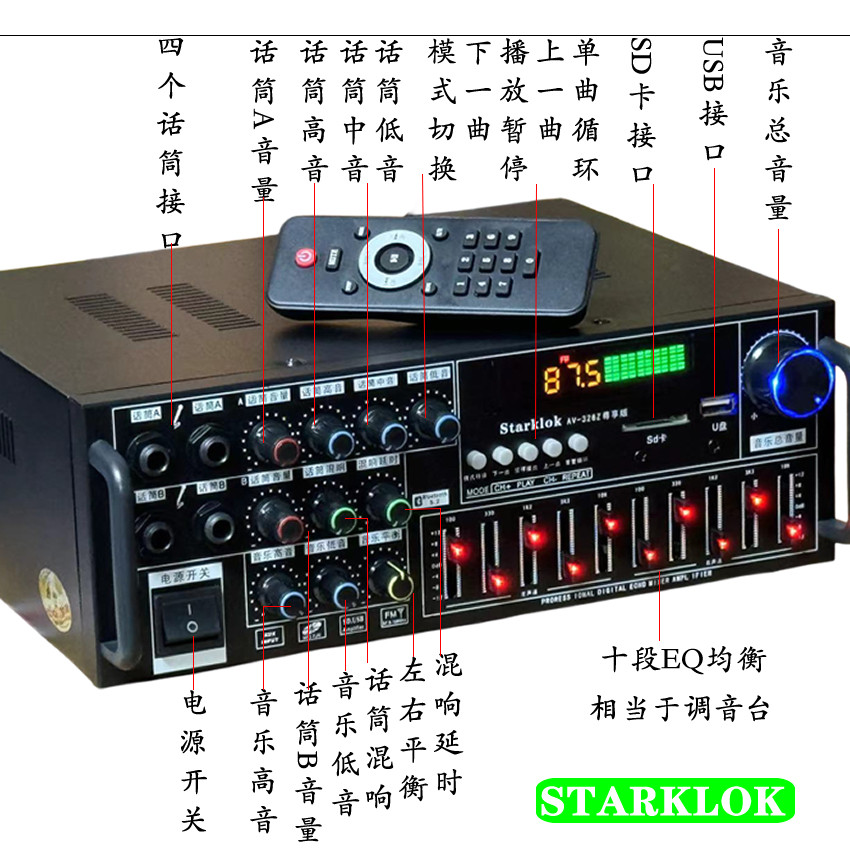 大功率家用功放蓝牙5.0震撼卡OK歌EQ均衡器12V广场舞车载户外两用