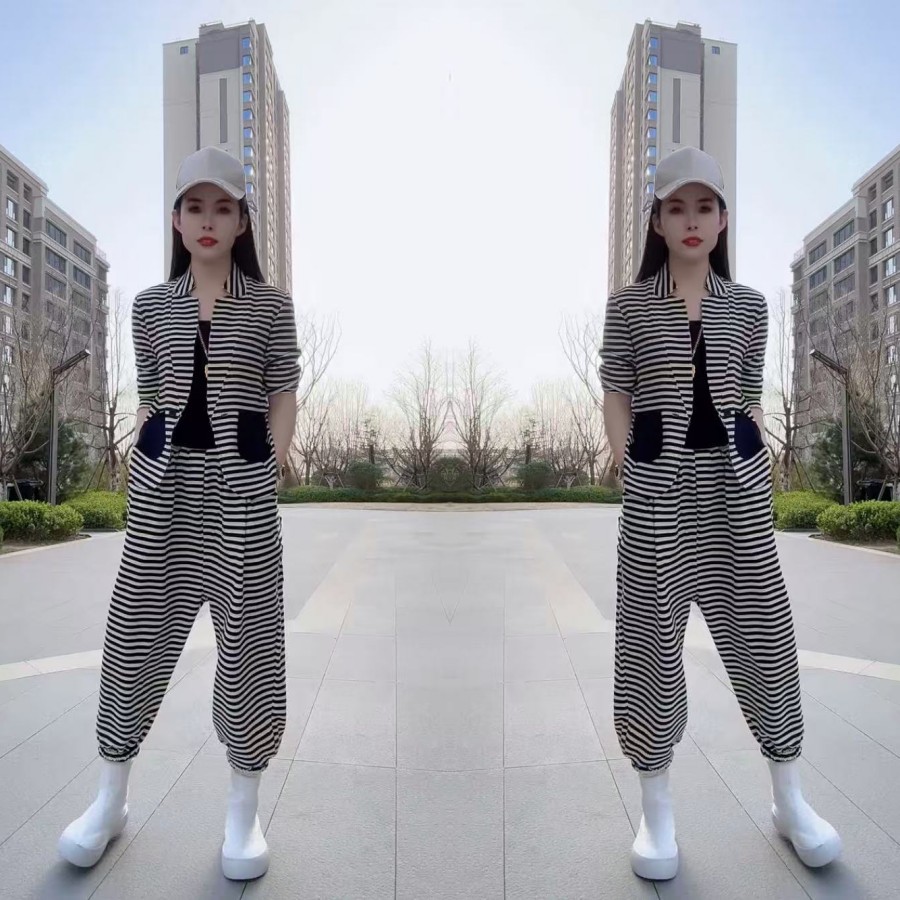 欧货潮牌时髦条纹西服外套休闲裤两件套2025春夏新款个性时尚套装