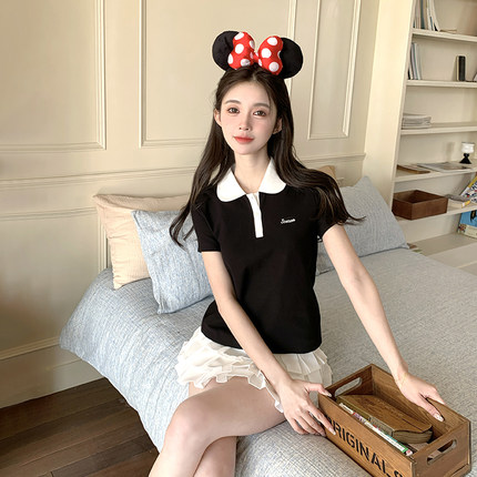 女士短袖正肩polo衫纯棉翻领学院风黑色修身T恤上衣东京岁时记jk