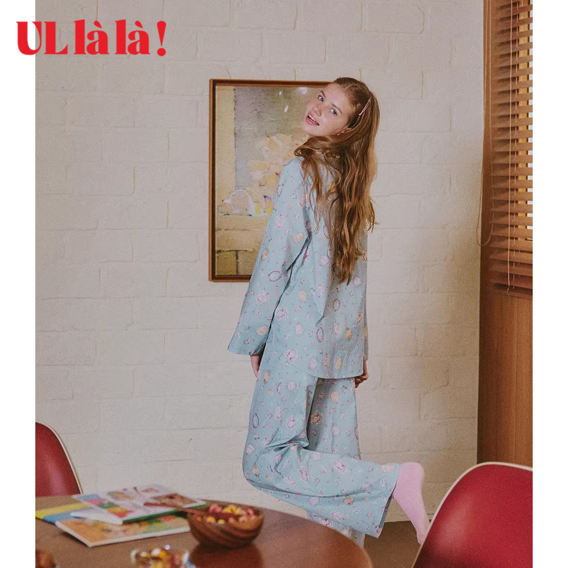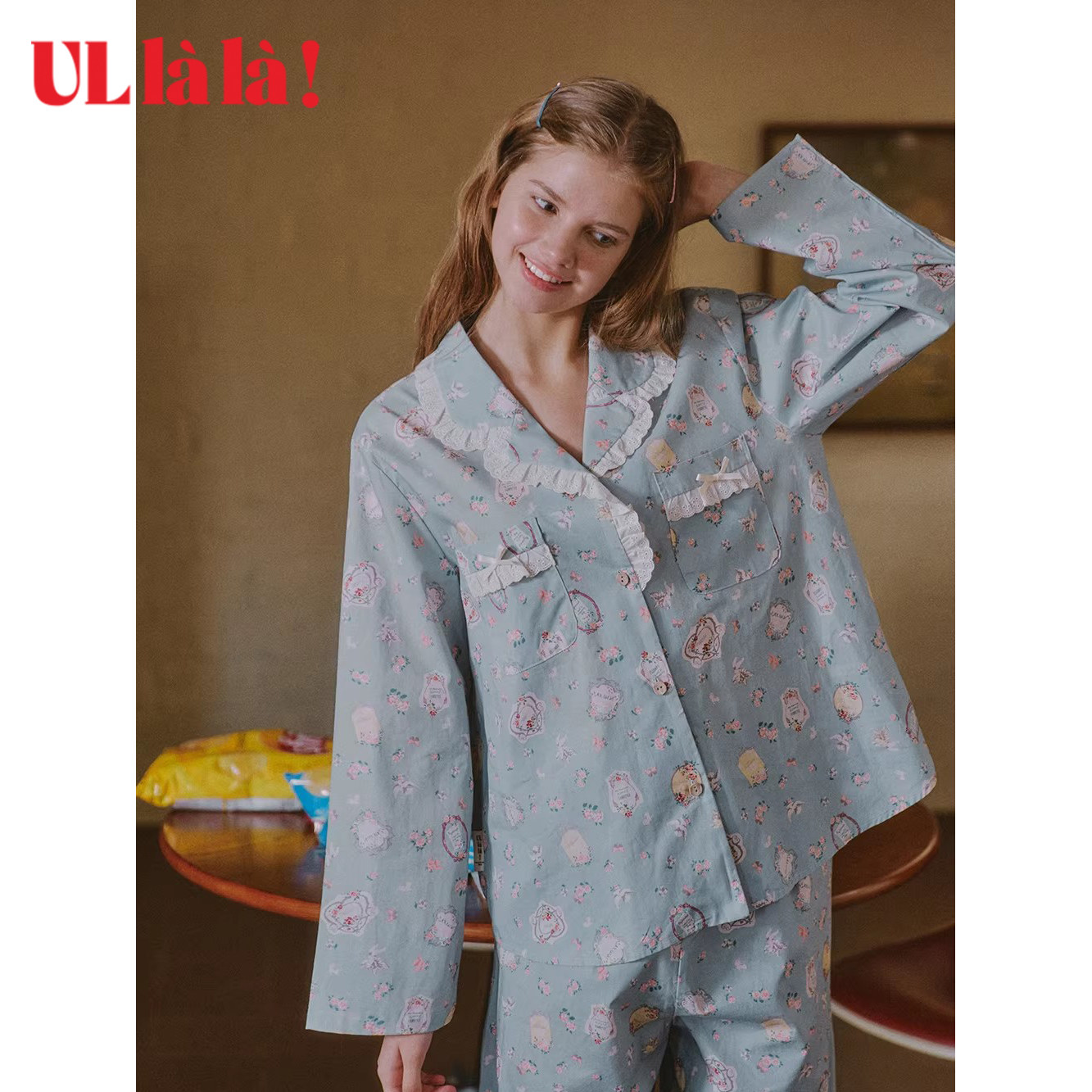 韩国进口ULLALA甜美女纯棉卡通印花睡衣翻领家居服套装长袖春夏薄