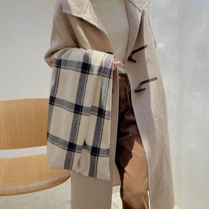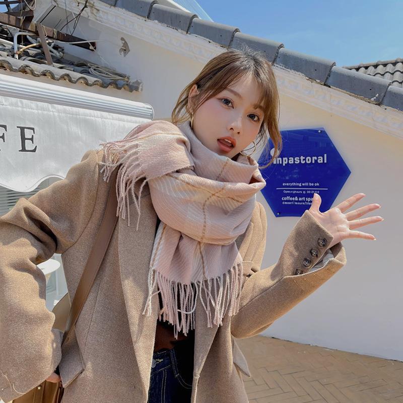 2025仿羊绒围巾女秋冬新款保暖围脖线条大方格日韩小清新外搭披肩