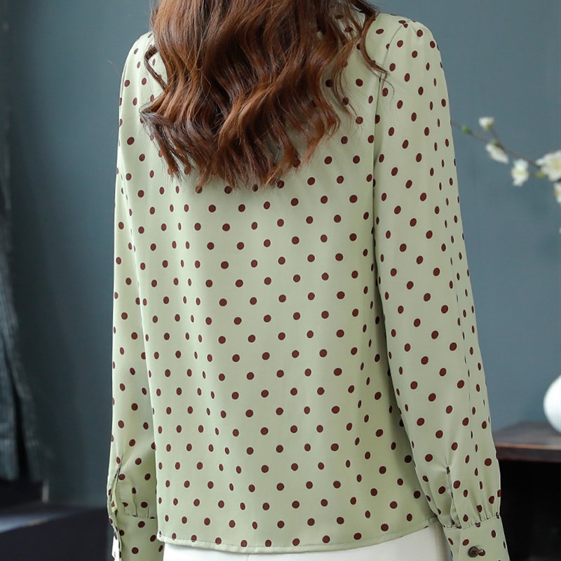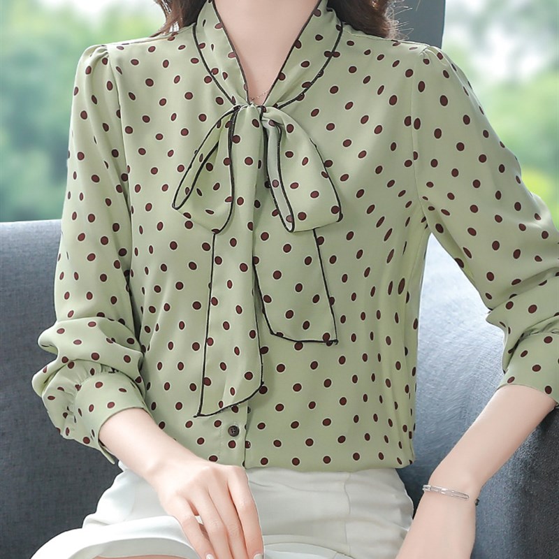 波点衬衫女士长袖早春装气质系带蝴蝶结衬衣中年妈妈雪纺上衣洋气