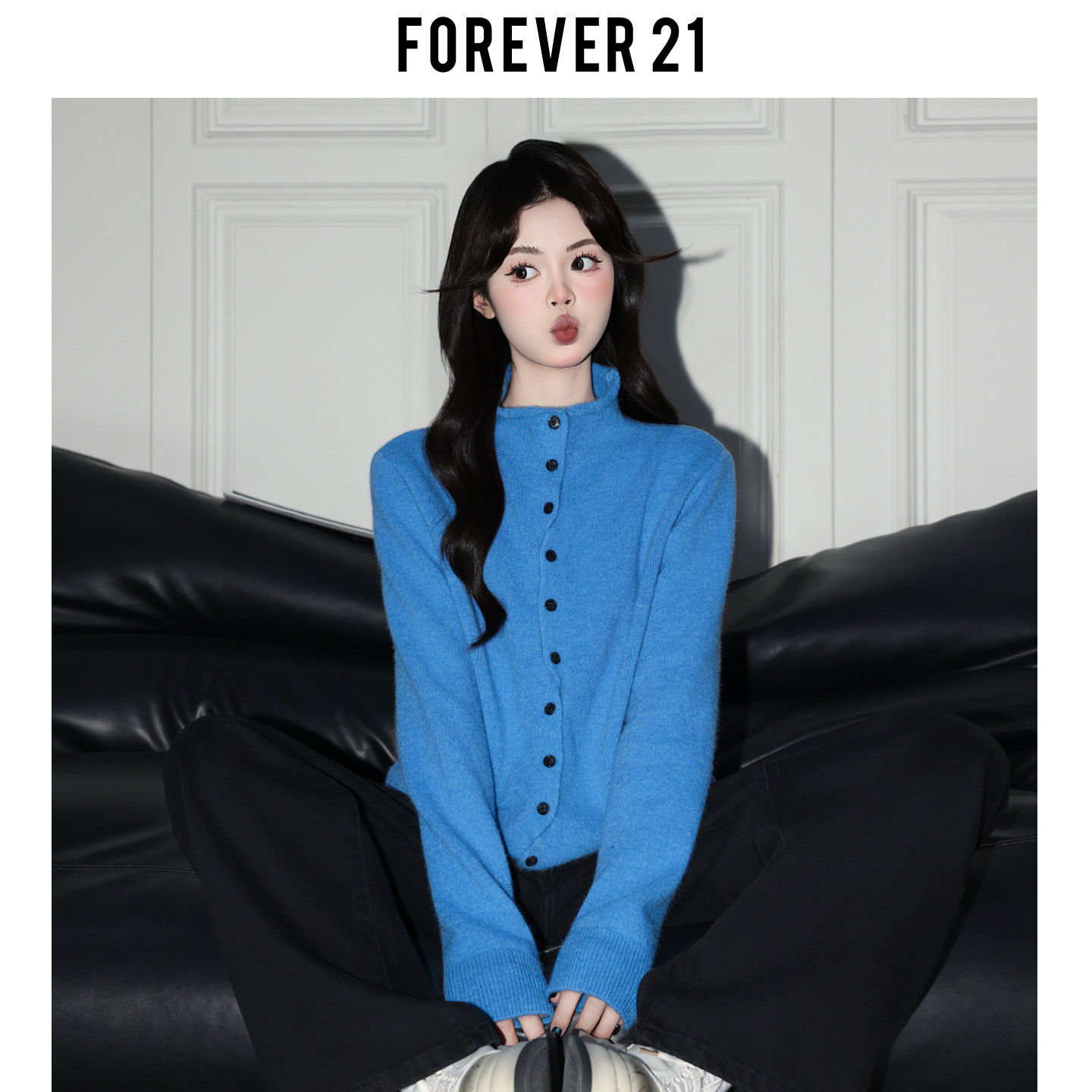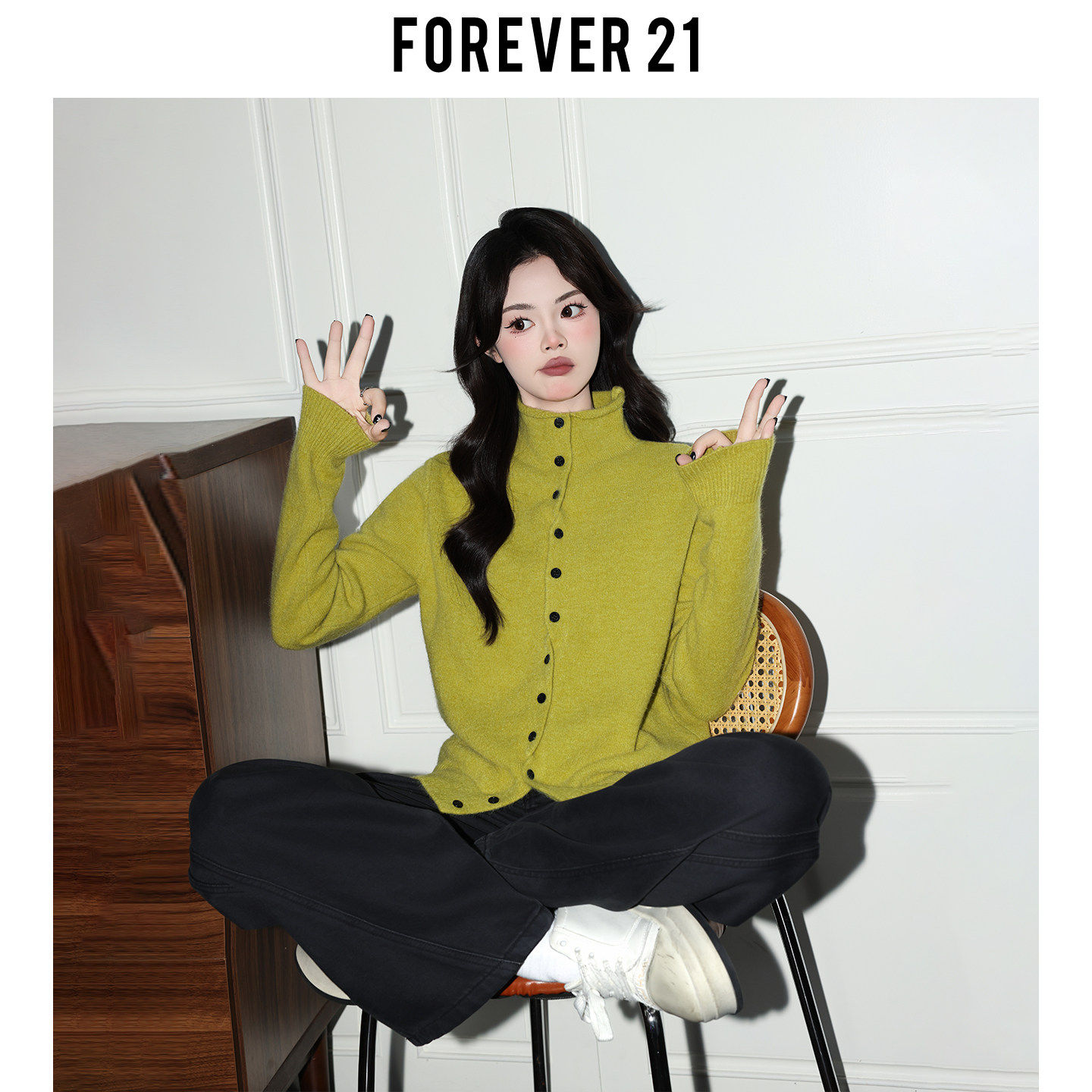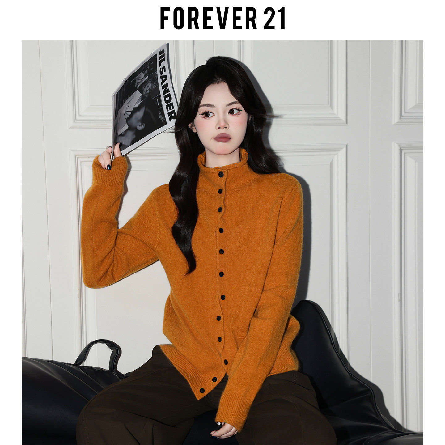 Forever 21韩系灰色高领长袖软糯毛衣女慵懒开衫宽松打底针织上衣