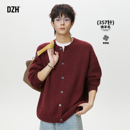 男士红色绵羊毛针织衫男款冬季2026新款老钱风毛衫外套开衫毛衣男