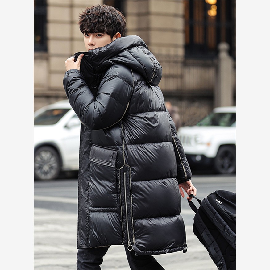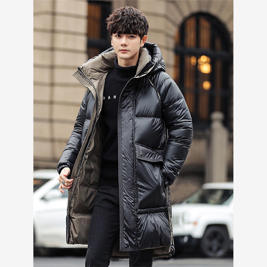 亮面免洗中长款羽绒服2025冬季新款青少年休闲大衣保暖黑色男外套