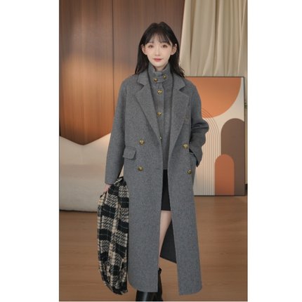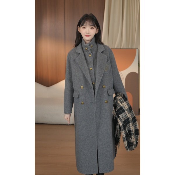 HSTYLE/韩都衣舍 气质秋冬宽松羊毛外套大衣长袖翻领双排扣8524