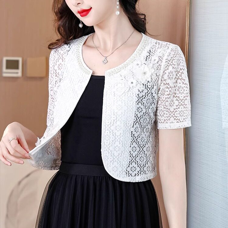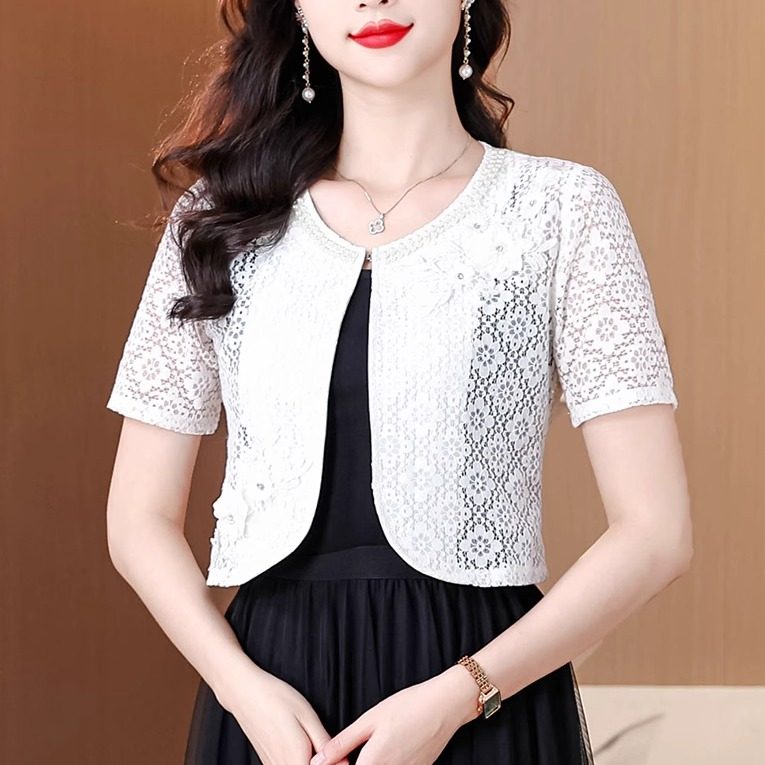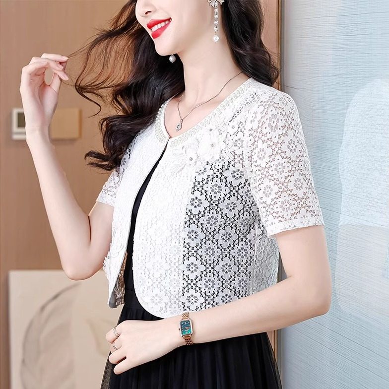 短款白色蕾丝百搭西装外套女士夏季短袖配裙子小披肩外搭开衫上衣