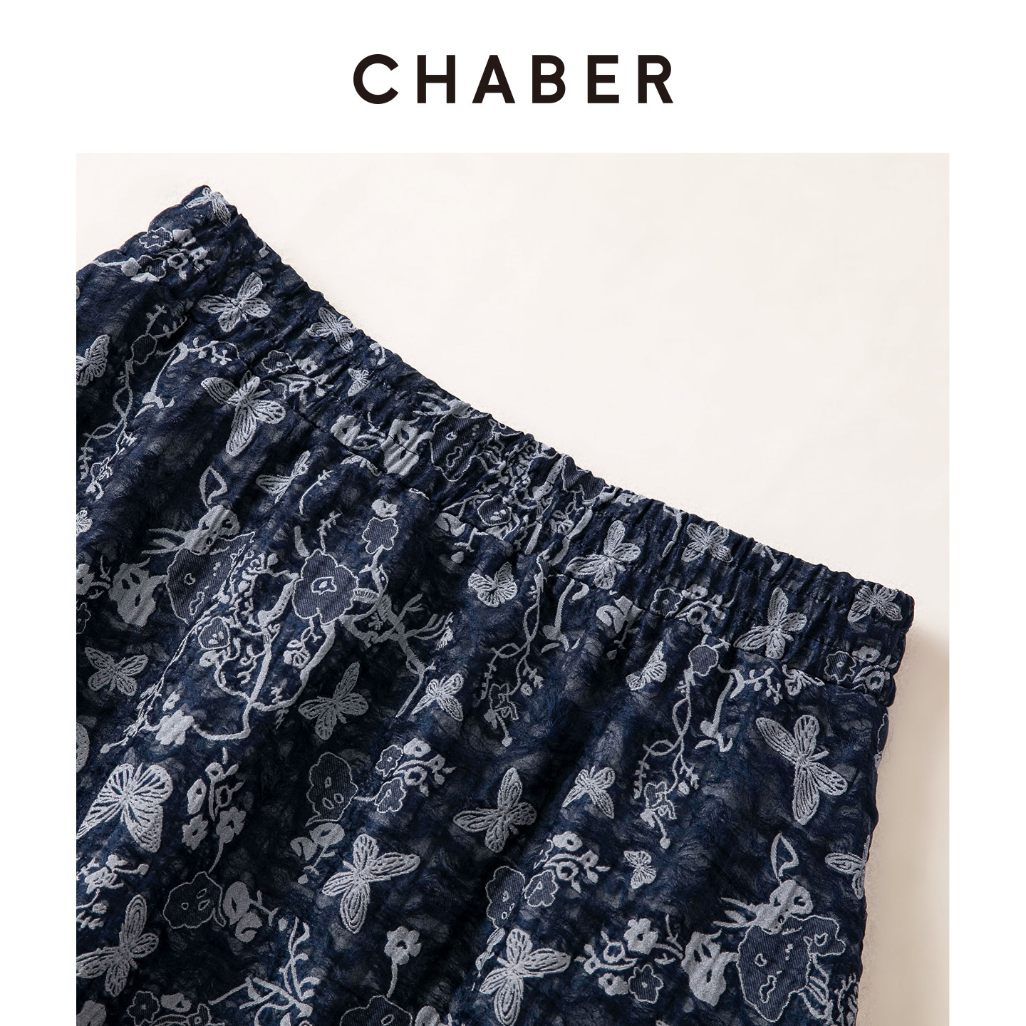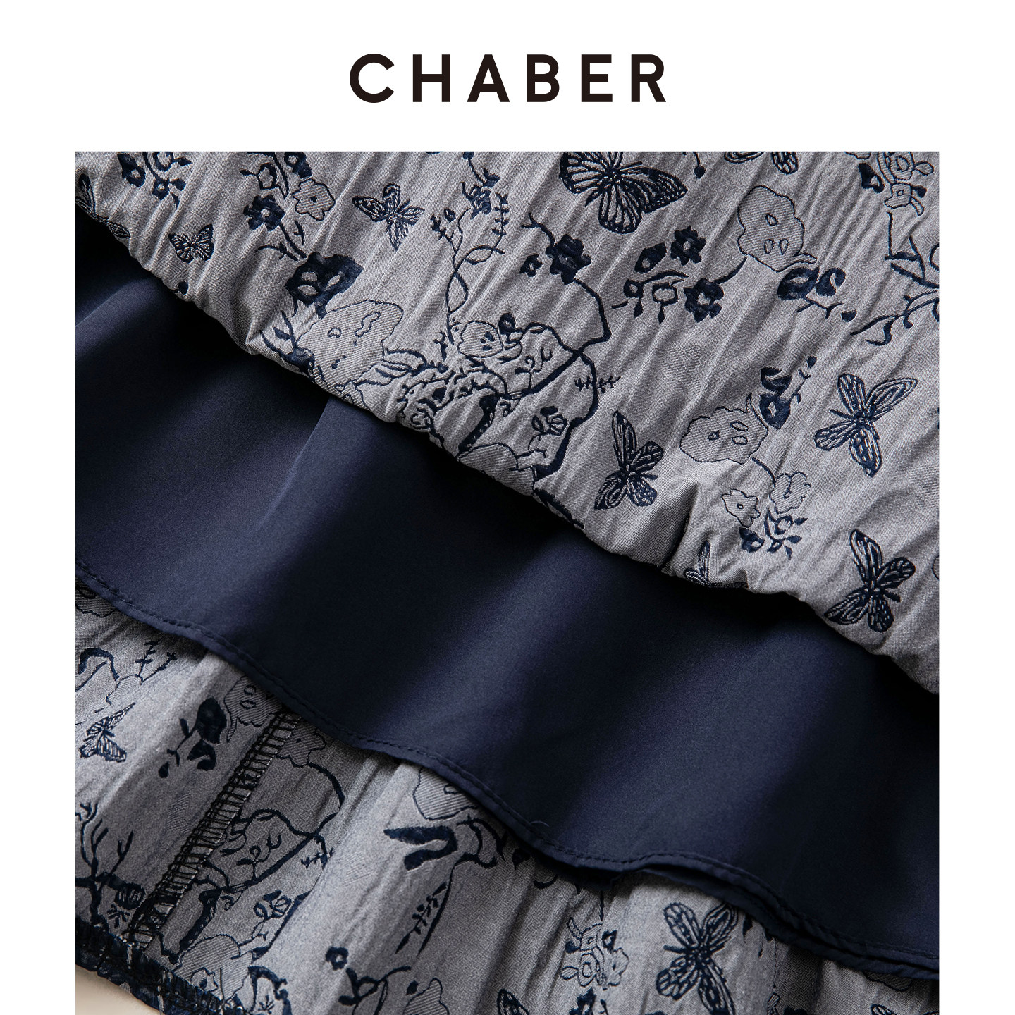 CHABER巧帛秋季新款松紧腰印花棉质裙子时尚国风提花A字半身裙