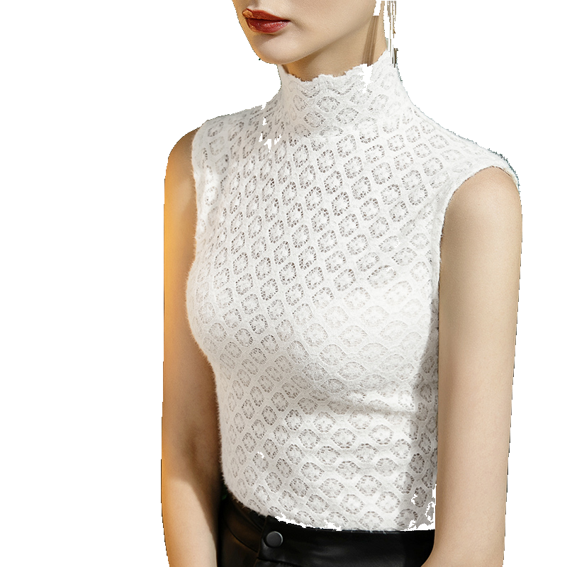 2022新秋冬假领立领蕾丝打底衫女磨毛无袖修身内搭格子高领背心女