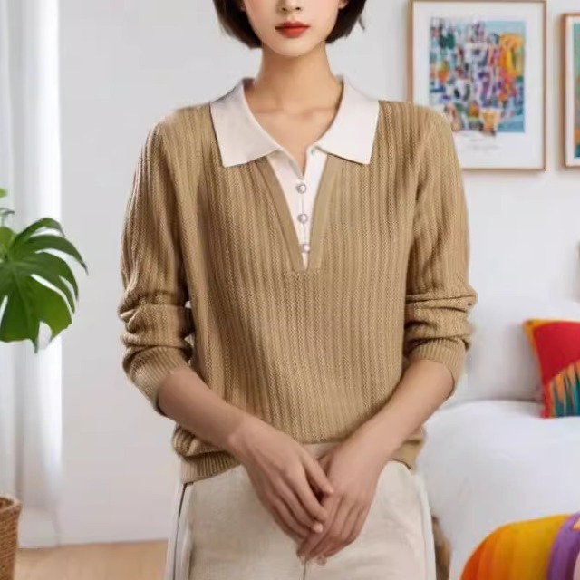 2025春秋新款翻领针织衫上衣大码中年妈妈装毛衣打底衫假两件毛衣