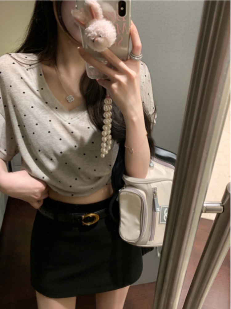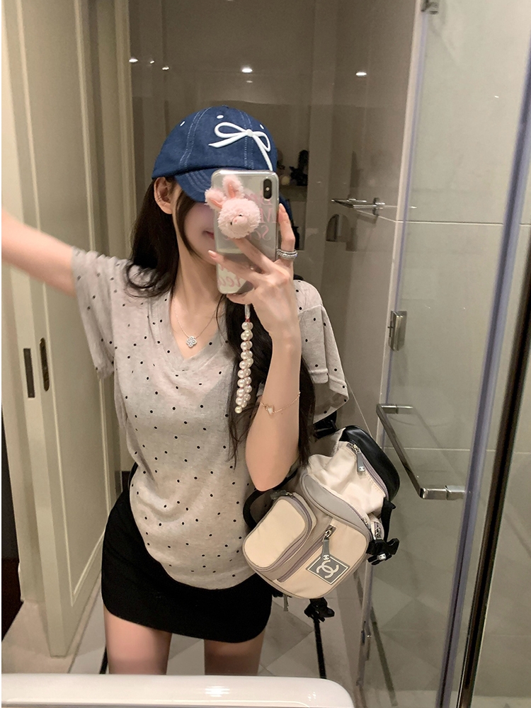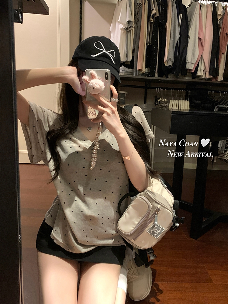 纯欲微透v领波点系列款短袖T恤女夏季设计款宽松百搭垂感薄款上衣