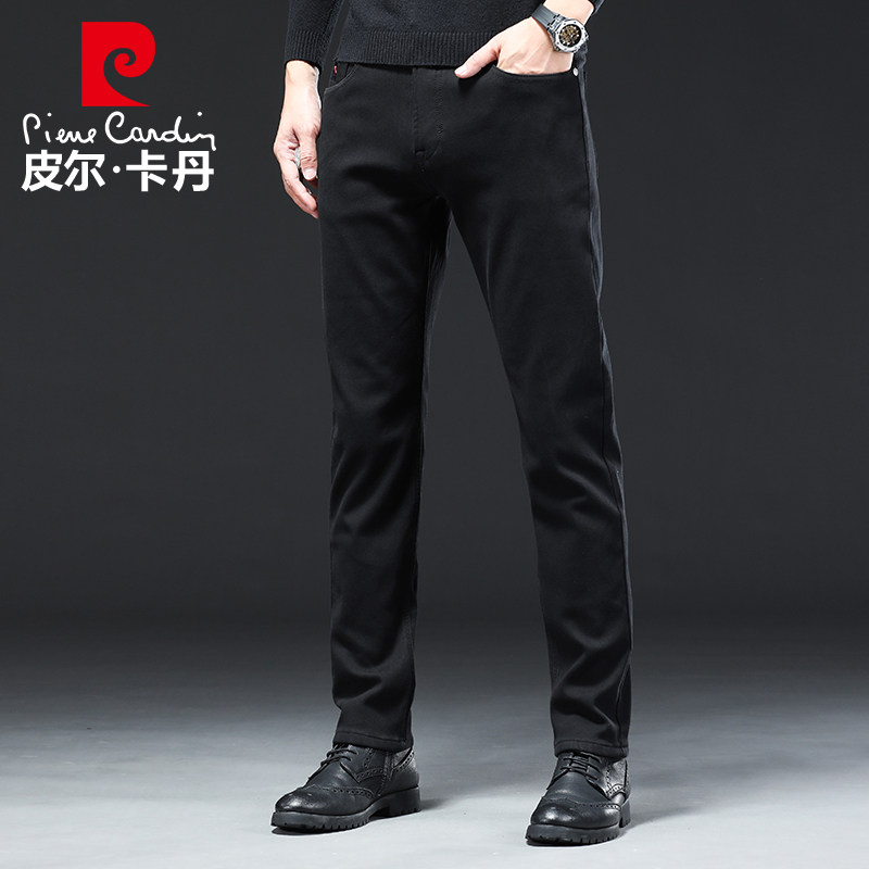 皮尔卡丹黑色加绒牛仔裤男士秋冬季加厚款保暖宽松直筒休闲长裤子
