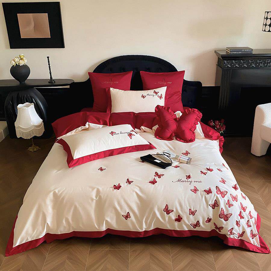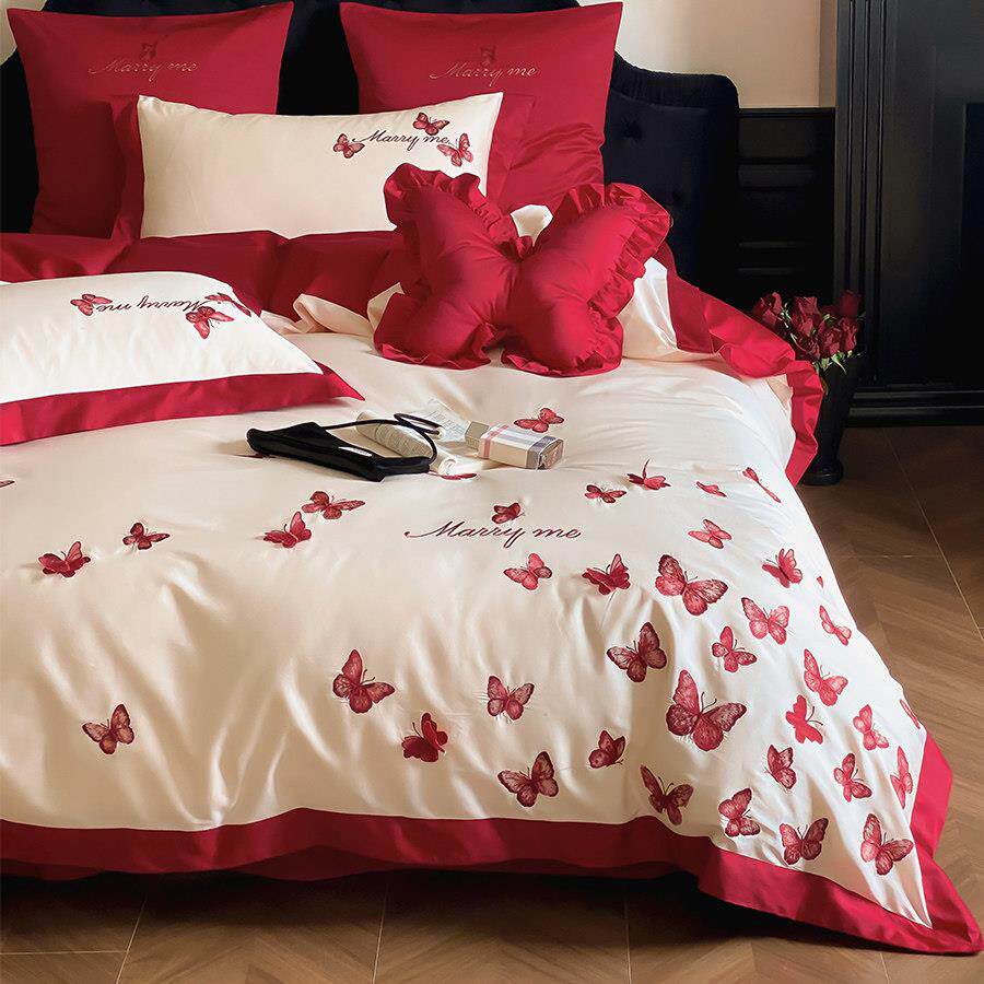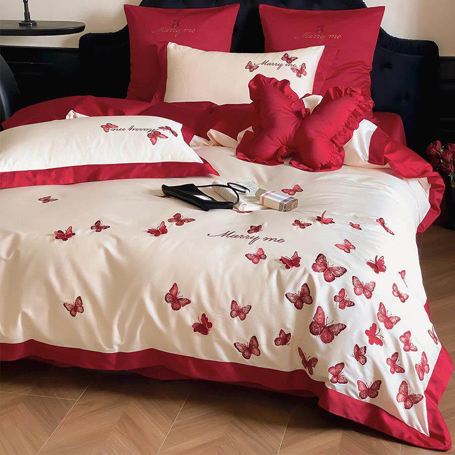 立体蝴蝶刺绣浪漫新婚庆四件组全棉100S红色结婚被套床单1.8床笠