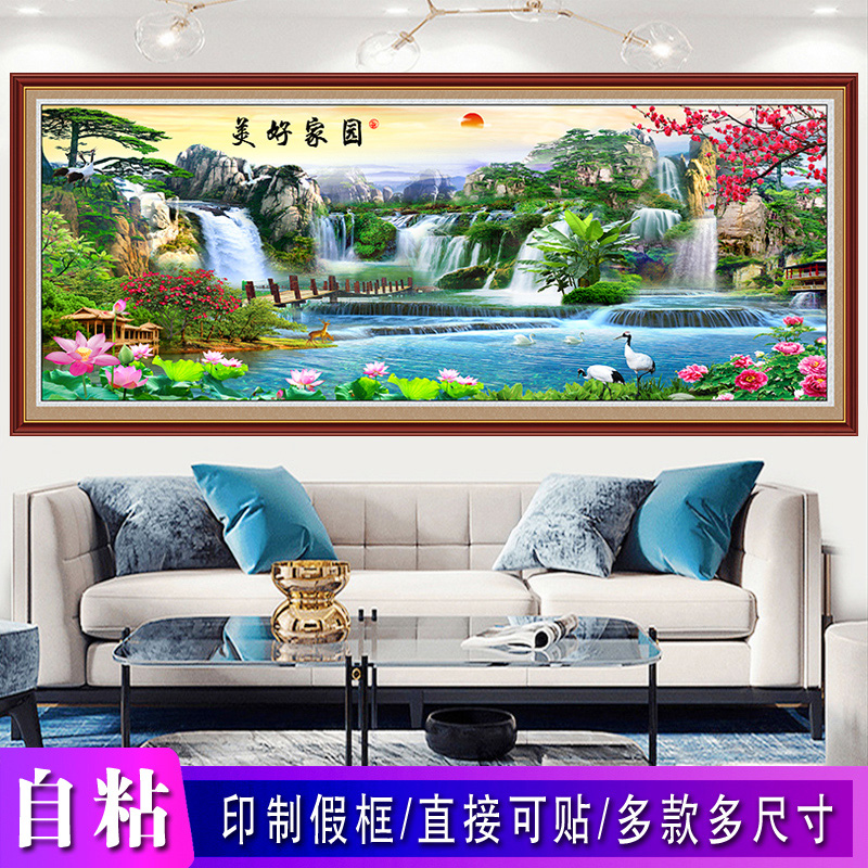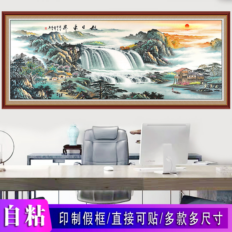山水风景画自粘墙贴画财源广进迎客松壁画背景墙流水生财红运当头