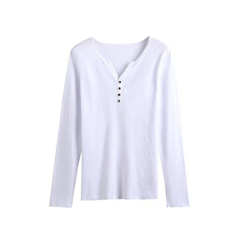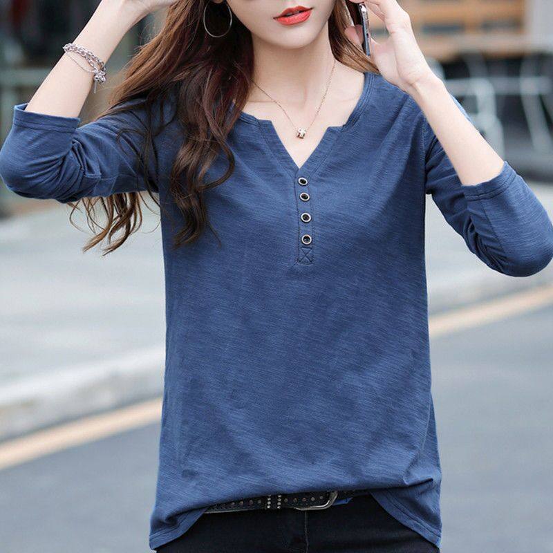 纯棉长袖V领t恤女2023春秋衣宽松显瘦竹节棉内搭打底衫减龄上衣潮