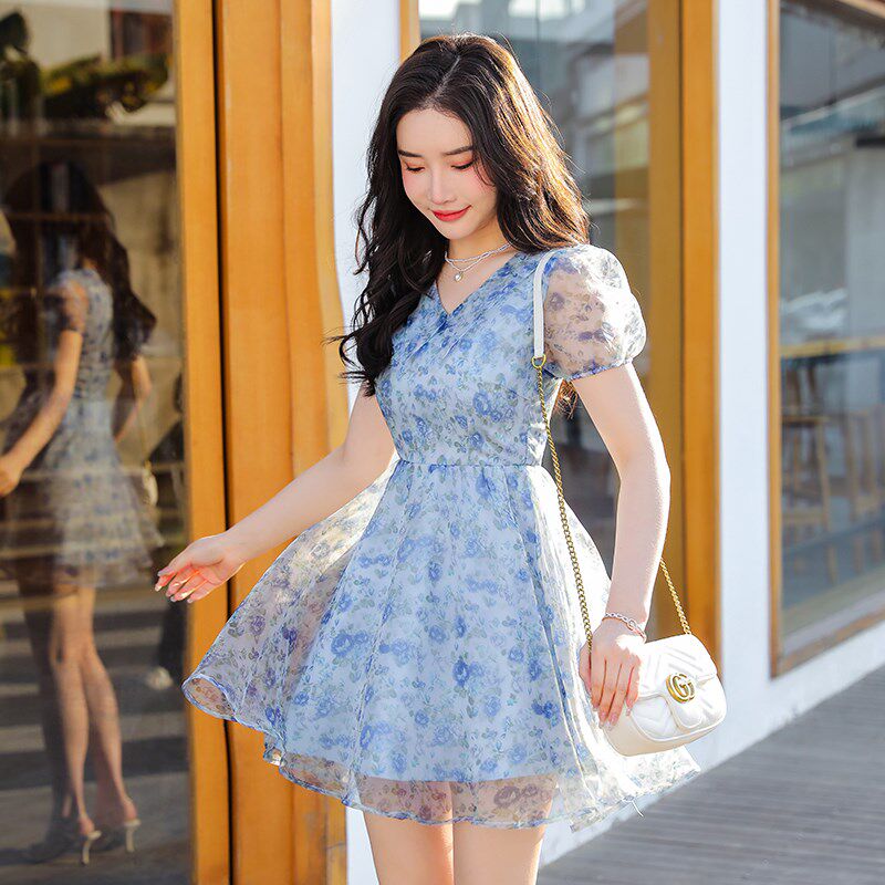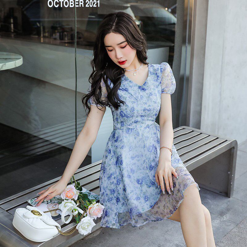 蓝色碎花雪纺矮小个子连衣裙2025新款夏装显高显瘦高级感气质裙子