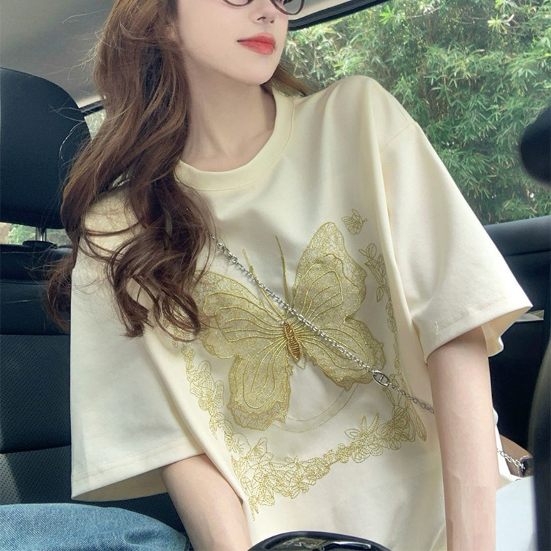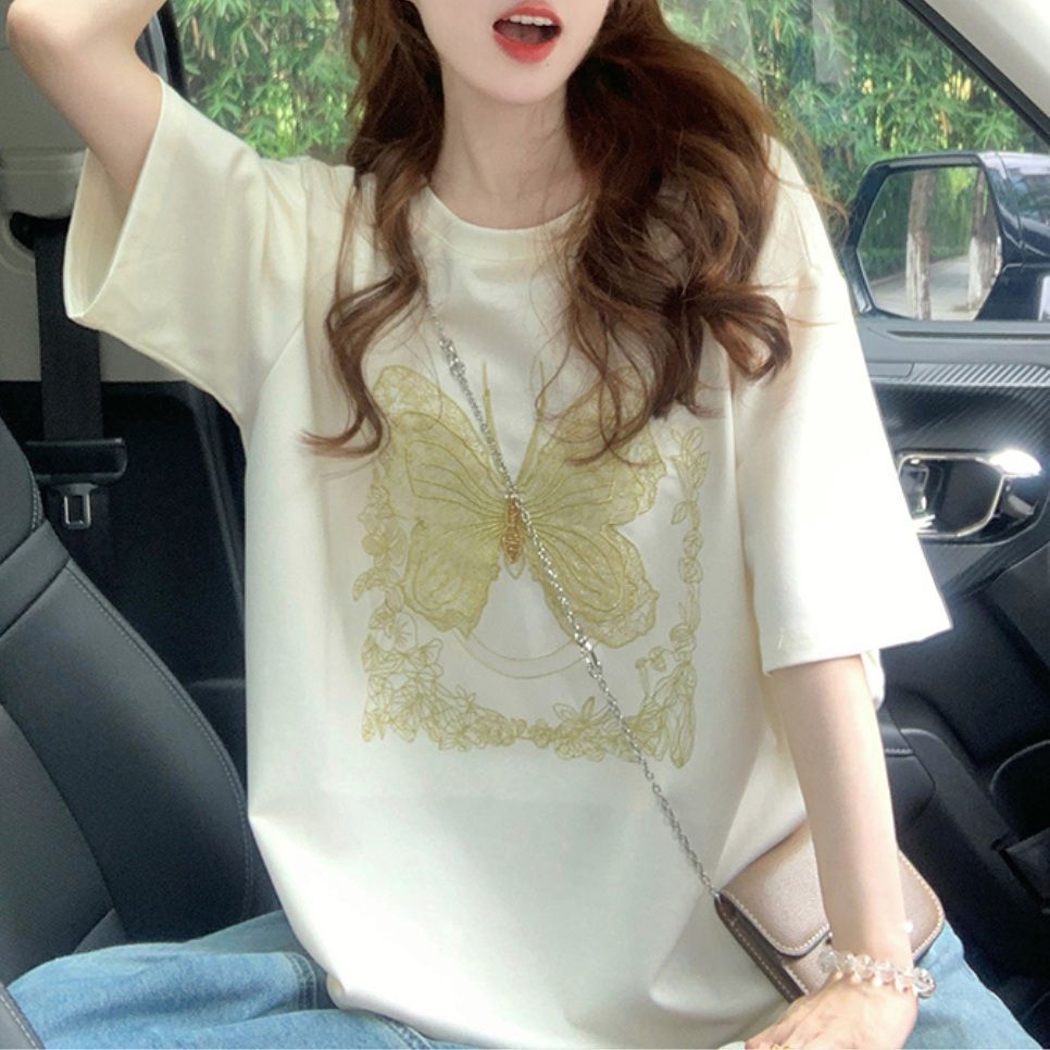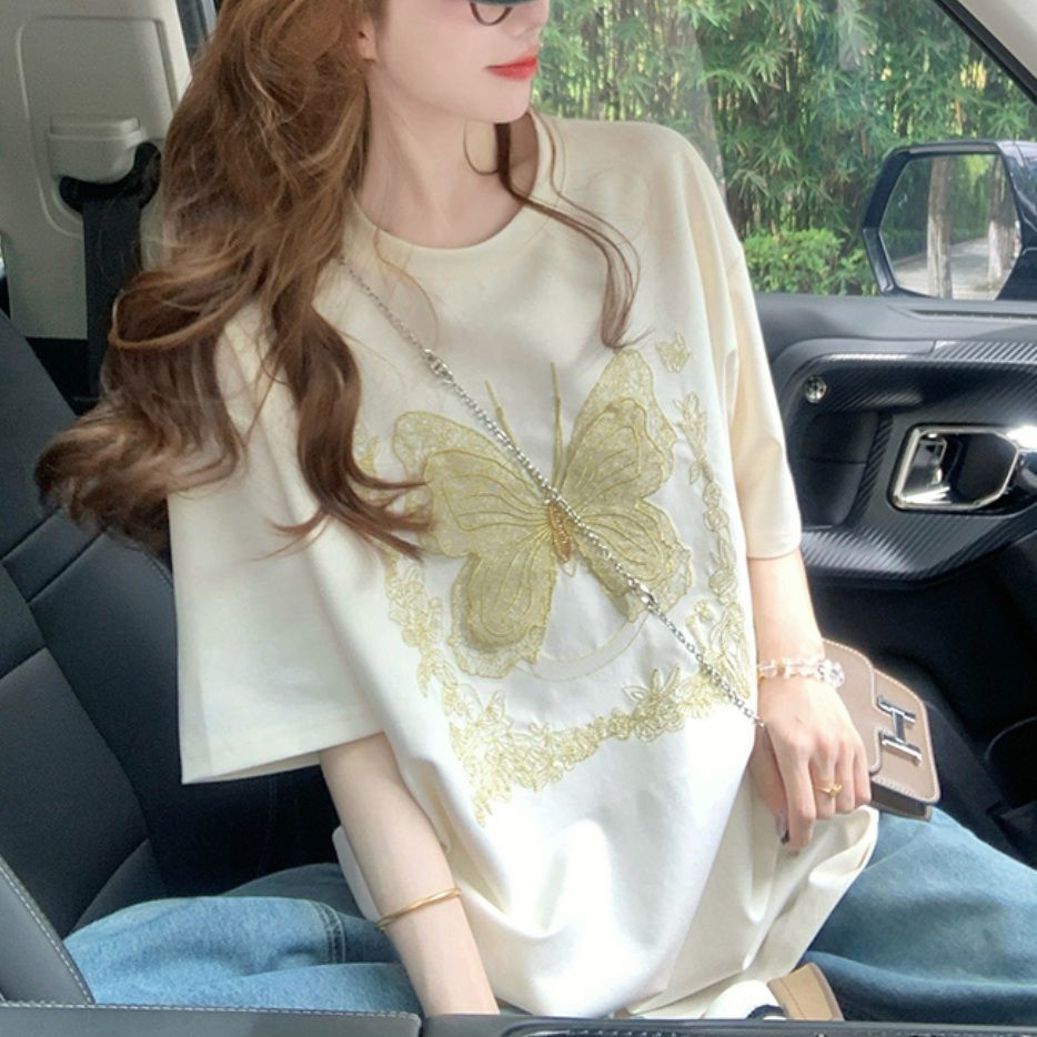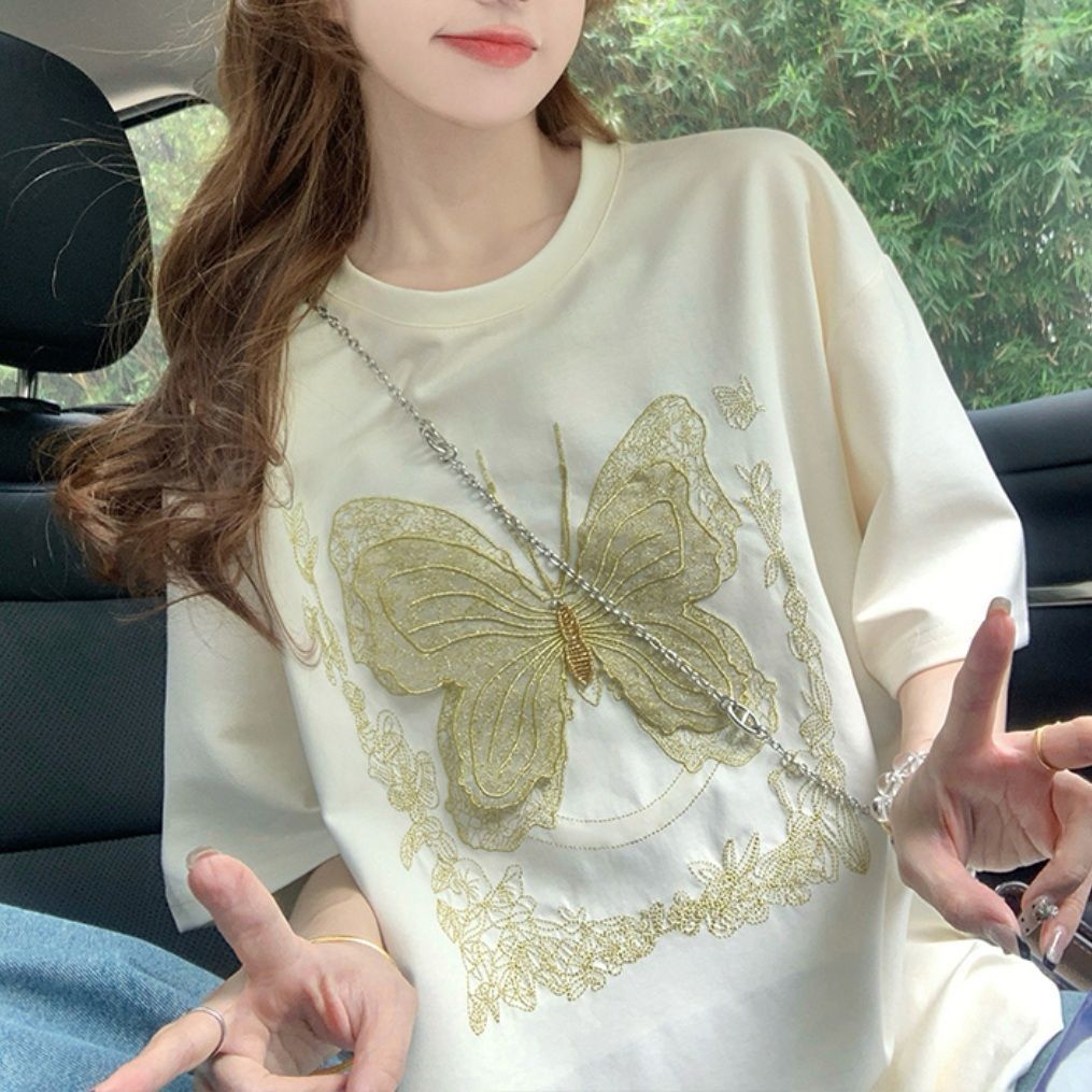 大码女装胖mm国风蝴蝶短袖t恤女2025新款夏季重工刺绣设计感上衣