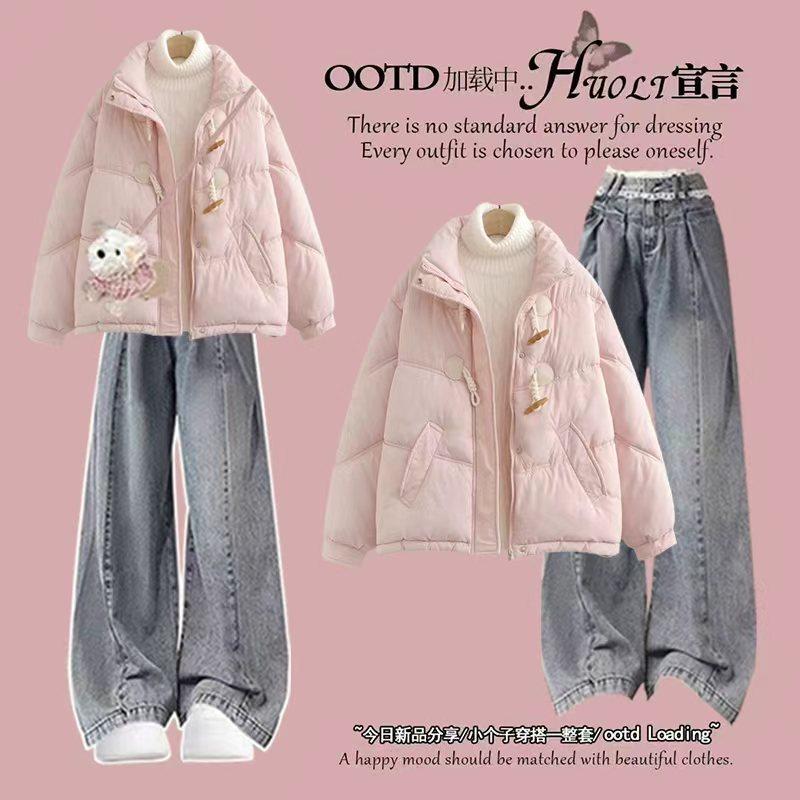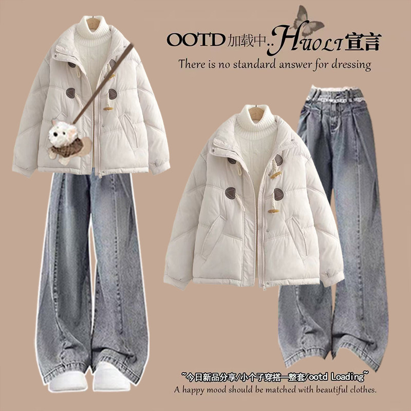 2025冬季套装女甜美清新牛角扣立领加厚棉服休闲牛仔裤两件套