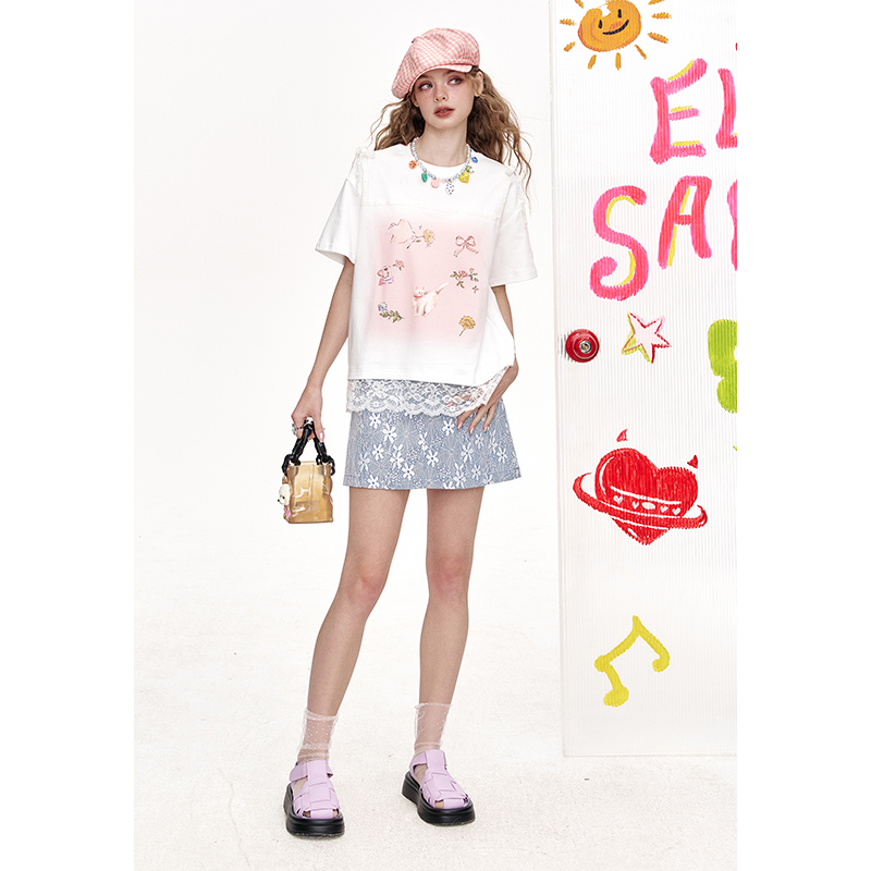 妖精的口袋蕾丝拼接印花短袖t恤女2025年夏新款宽松休闲小众上衣