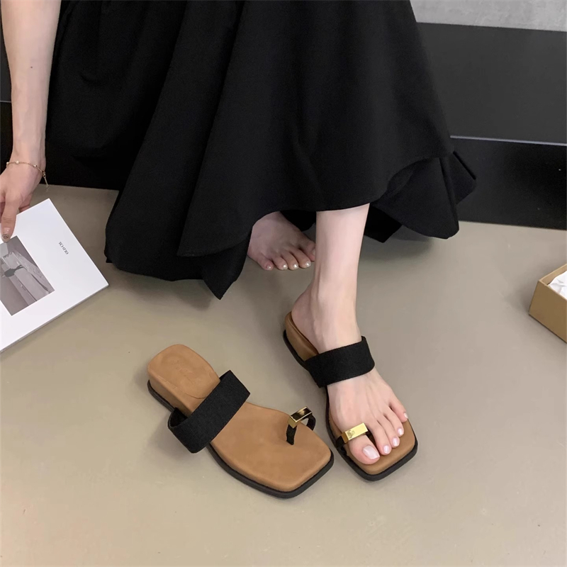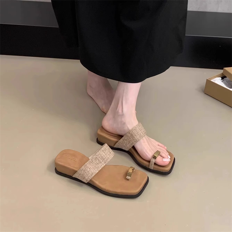 厚底亚麻拖鞋女外穿夏季法式一字拖套趾坡跟凉鞋舒适度假风沙滩鞋