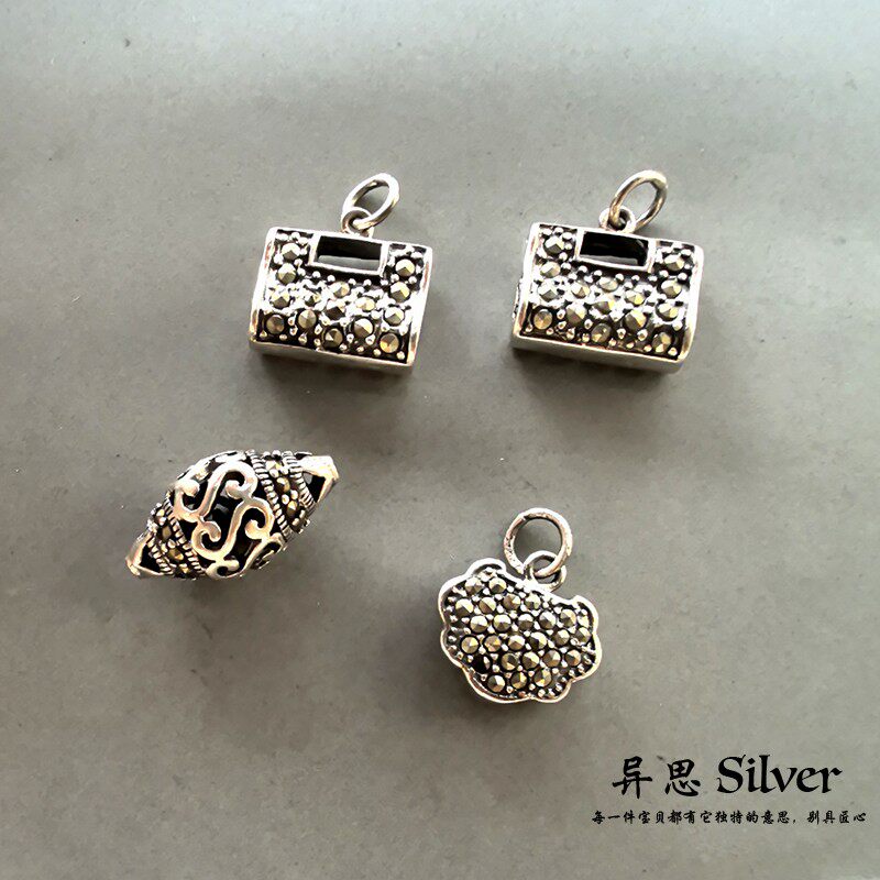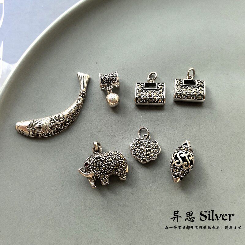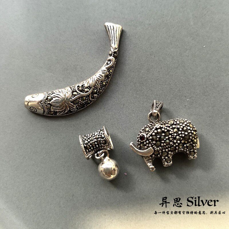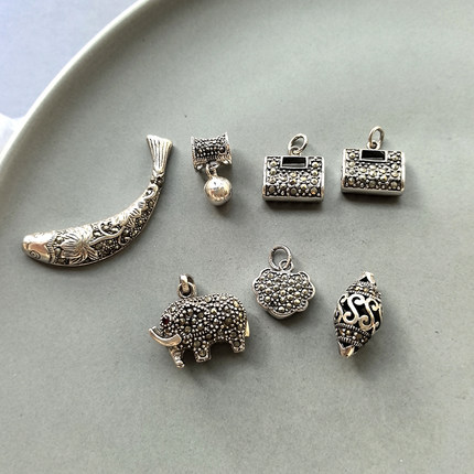 泰国手工镶嵌马克赛石925纯银吊坠鱼儿小象长命锁 乌金石复古配件