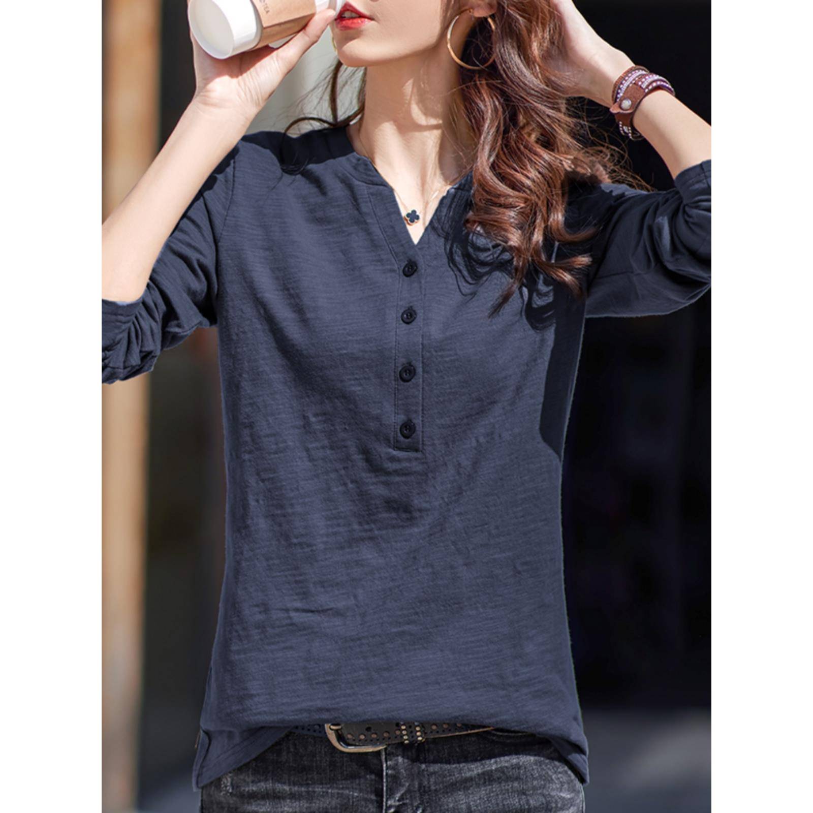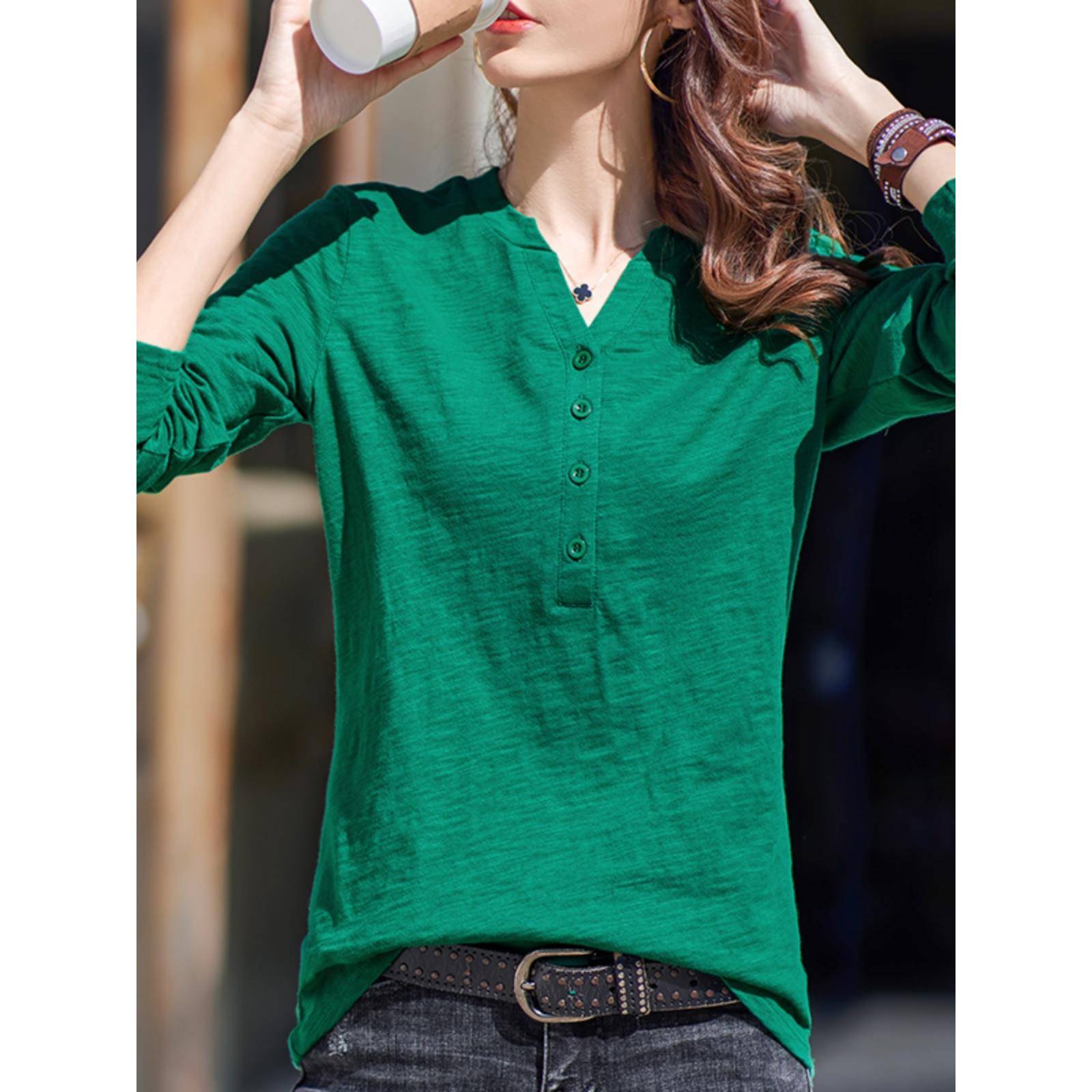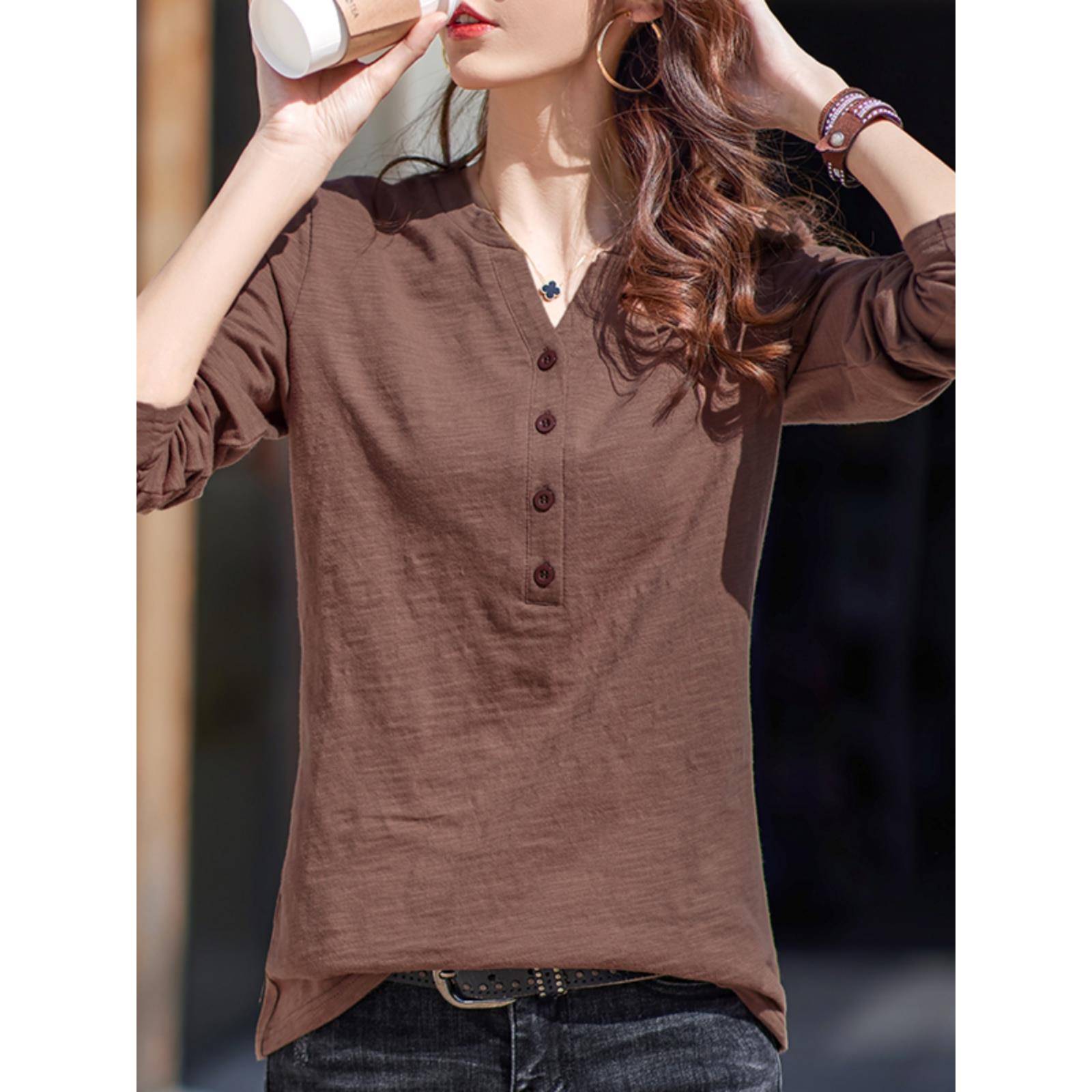 纯棉长袖t恤女装宽松秋装2025年新款竹节棉早秋纽扣v领上衣小衫潮