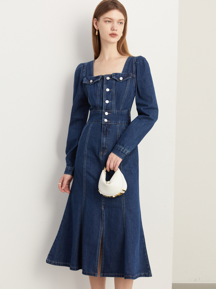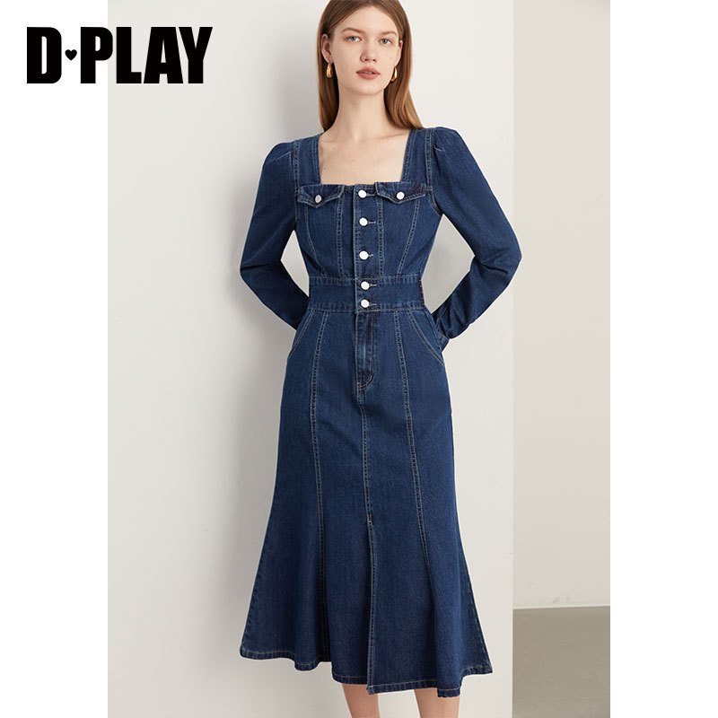 DPLAY秋装新法式牛仔蓝方领泡泡袖鱼尾前开衩长袖牛仔连衣裙