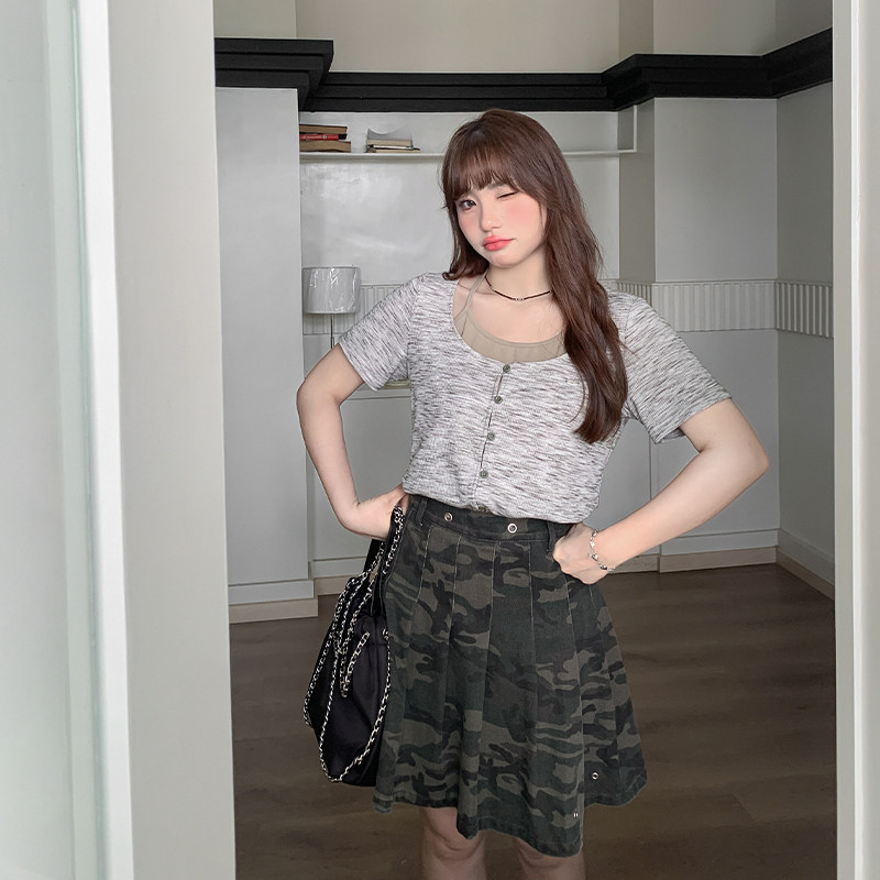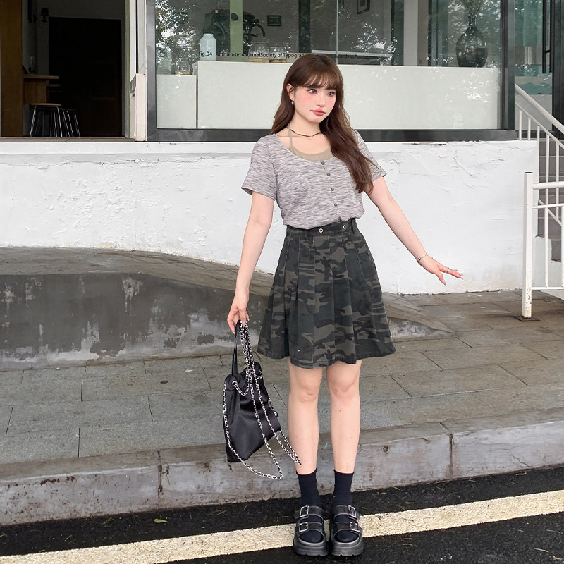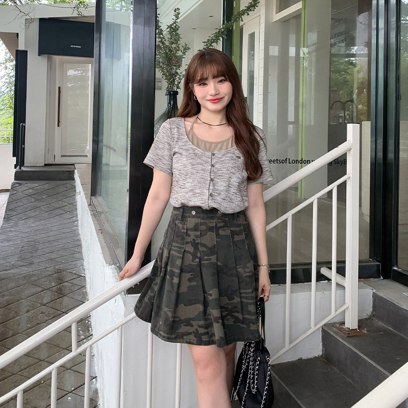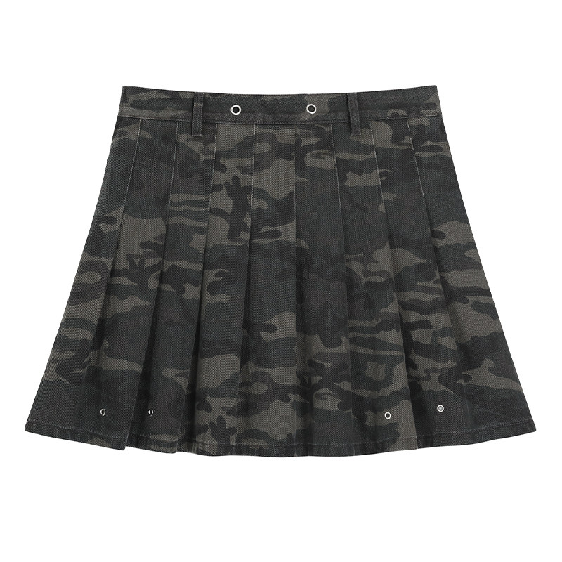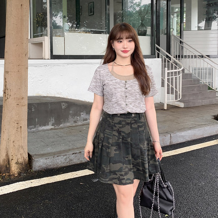 【清仓】小波家2026夏季胖mm高腰迷彩牛仔半身裙防走光百褶裙