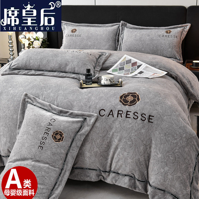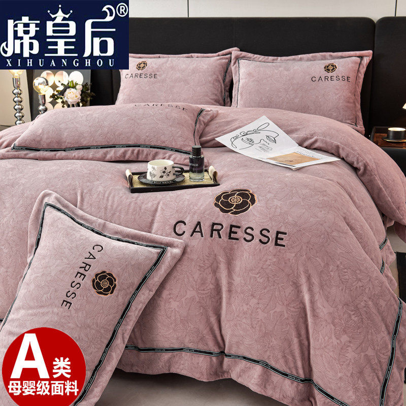A类牛奶绒四件套冬季加厚保暖珊瑚绒被套床单床上用品刺绣四件套