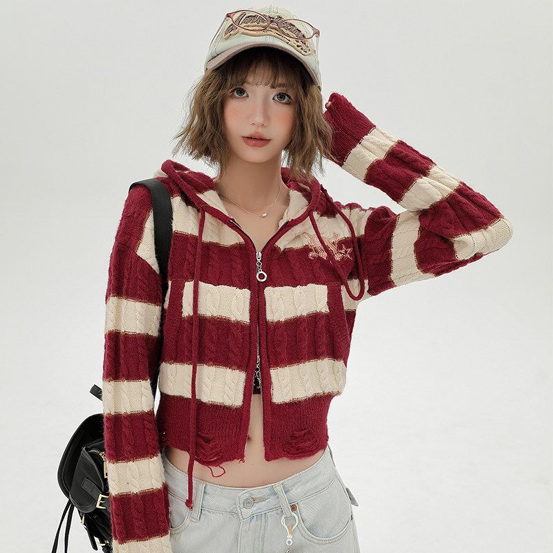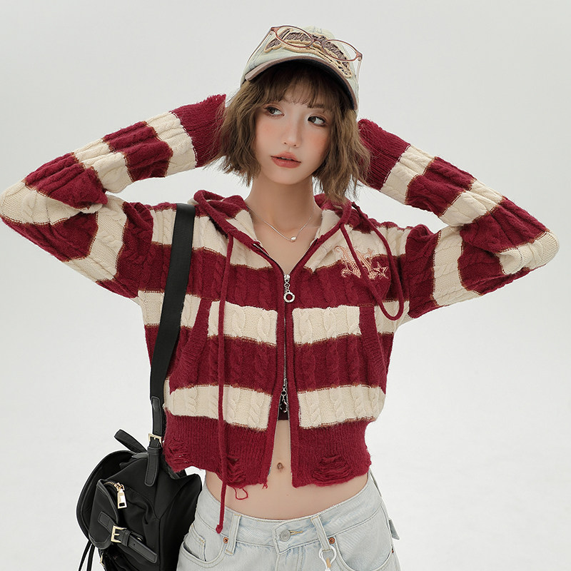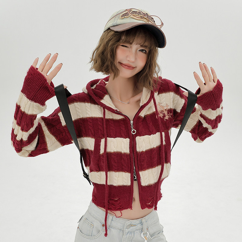 Girlyhalo美式辣妹条纹毛衣开衫外套女秋季短款修身显瘦针织衫