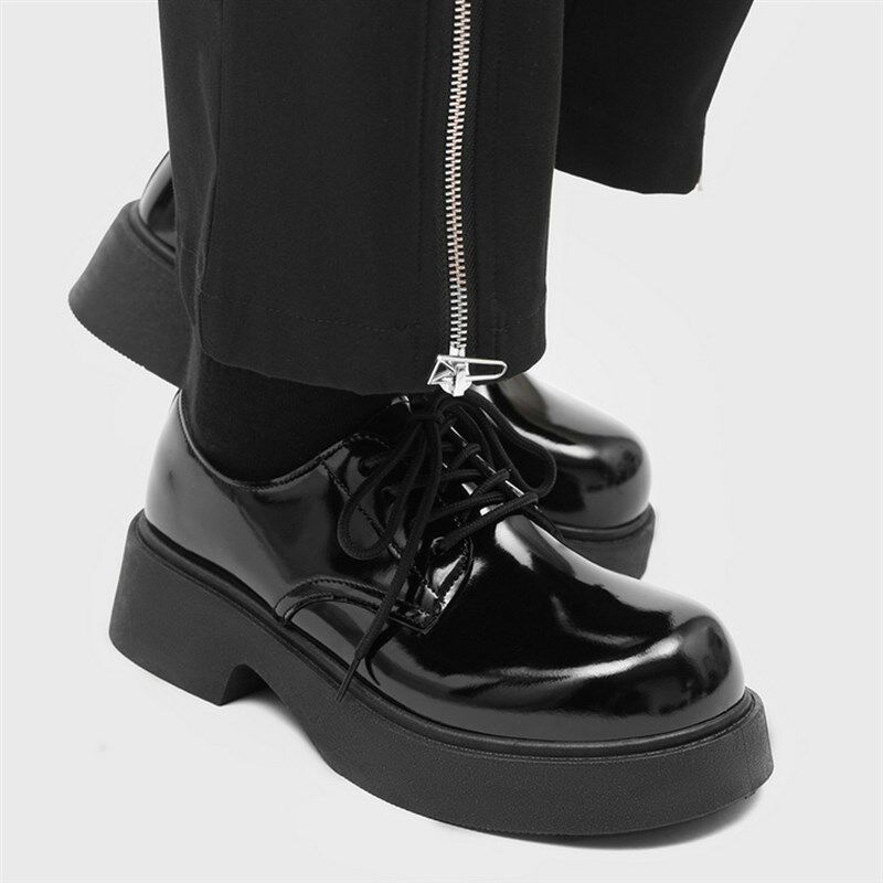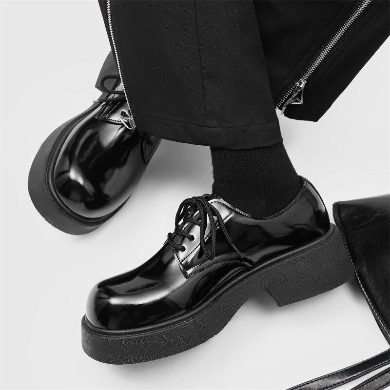 马丁鞋男鞋黑色痞帅亮面潮低帮厚D底增高大头德比鞋小码圆头皮鞋