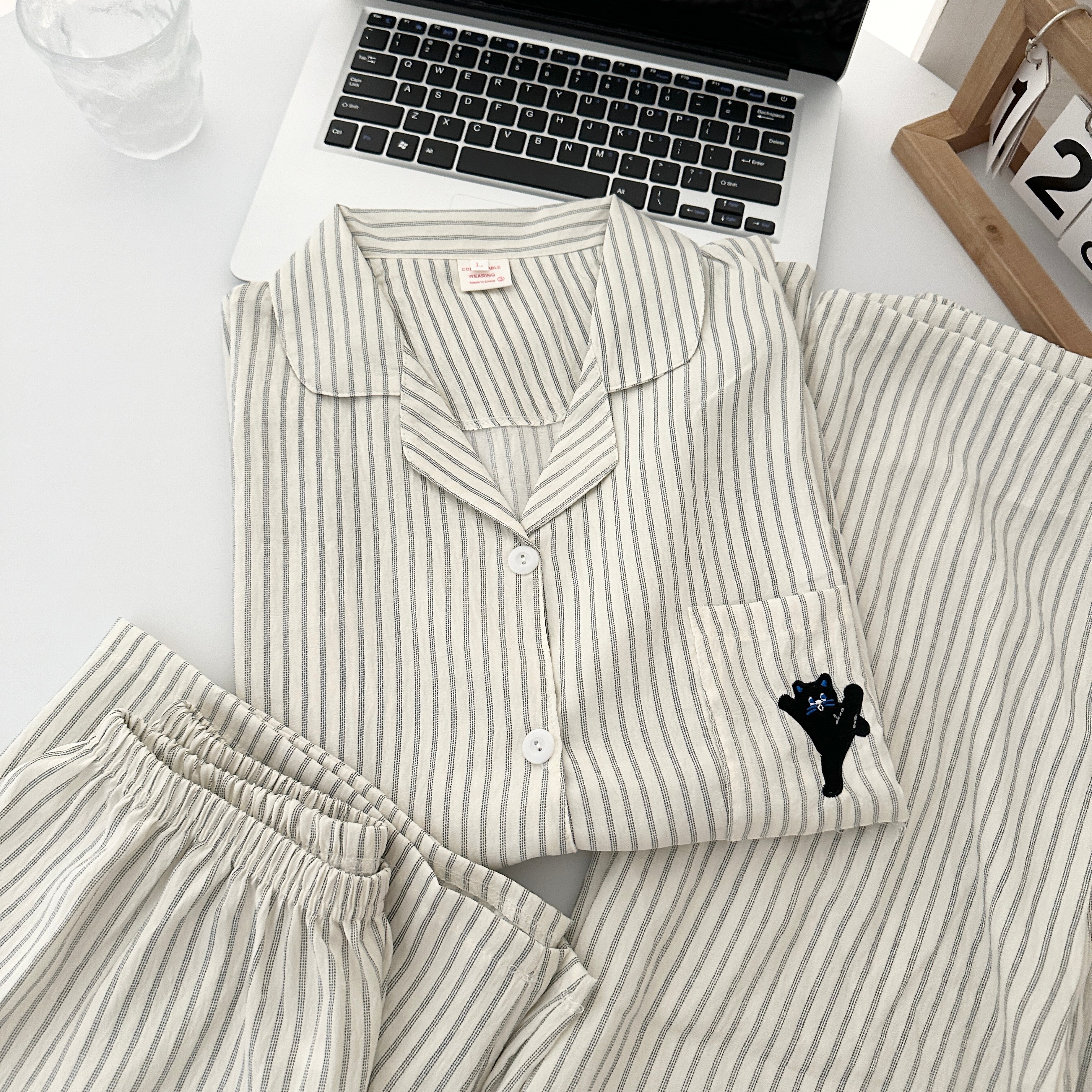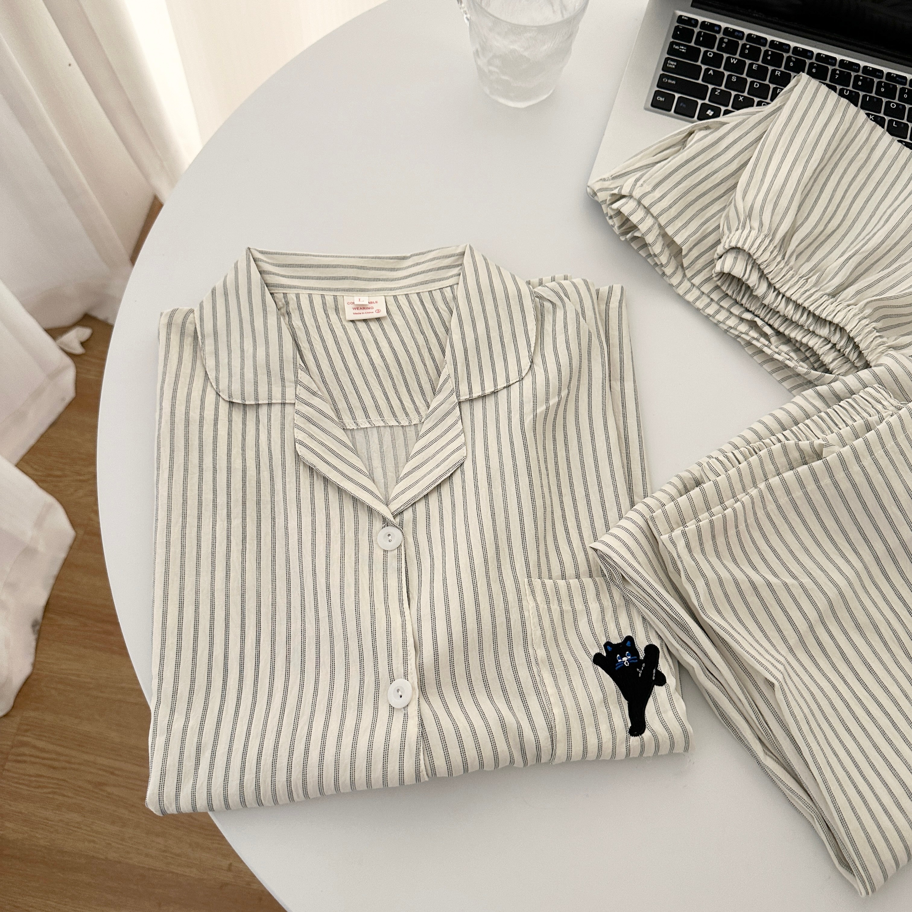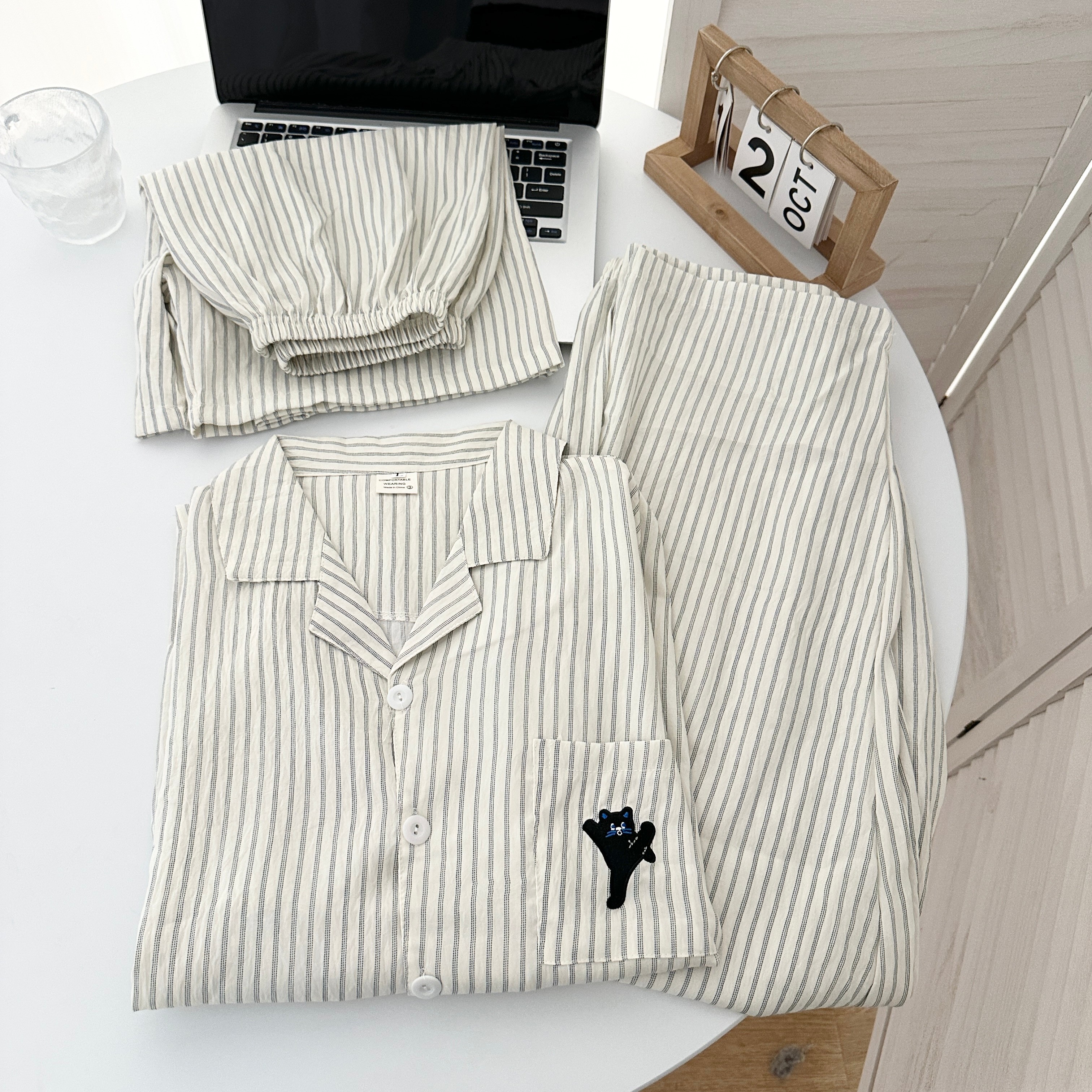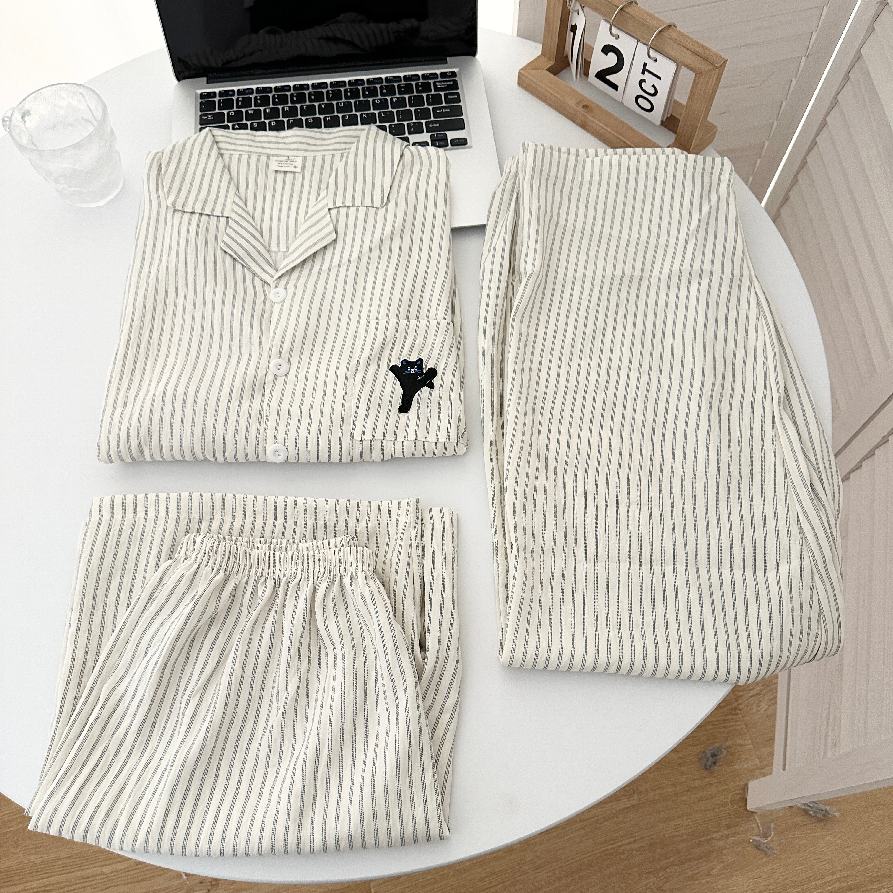 WALKING 三件套情侣刺绣腊小黑猫睡衣男夏少女短袖短裤长裤家居服