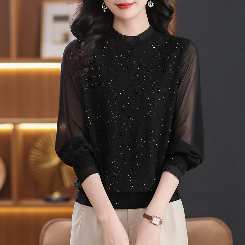 蕾丝边桑蚕丝针织衫针织衫女春秋装薄款妈妈冰丝上衣遮肚子打底衫