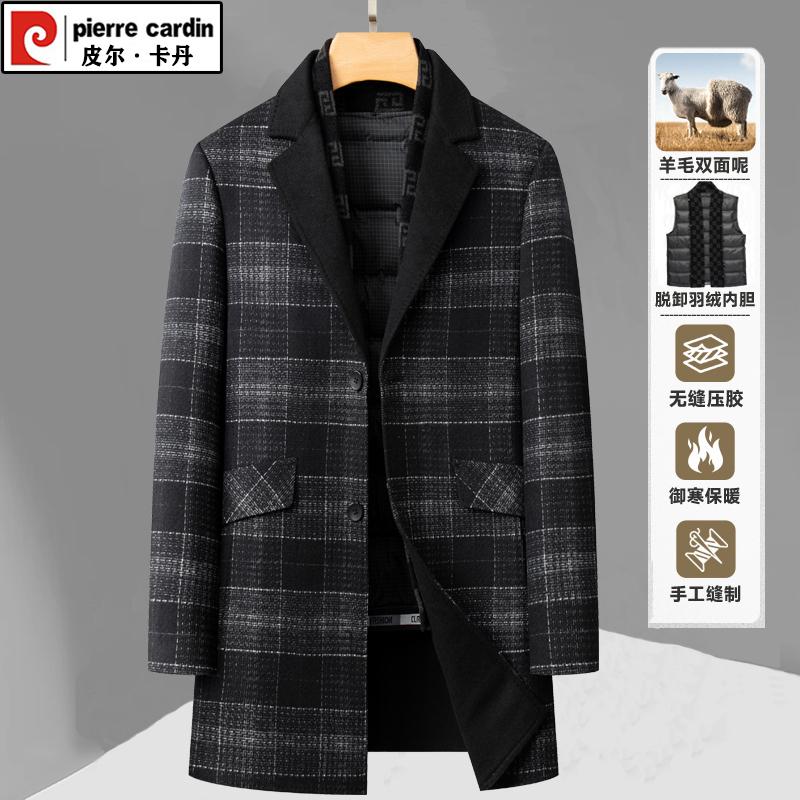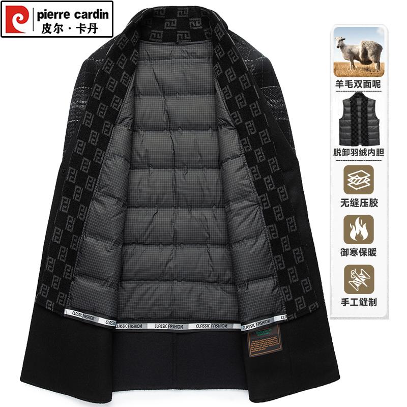 皮尔卡丹冬季男士双面羊毛呢大衣中长款外套围巾领加厚青中年羽绒