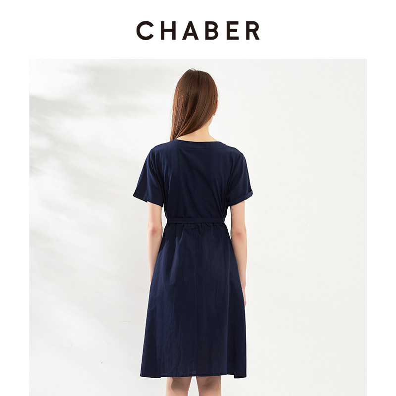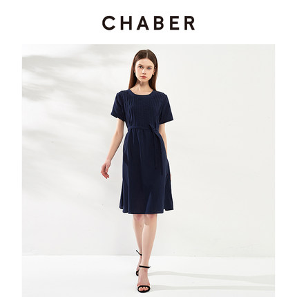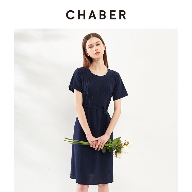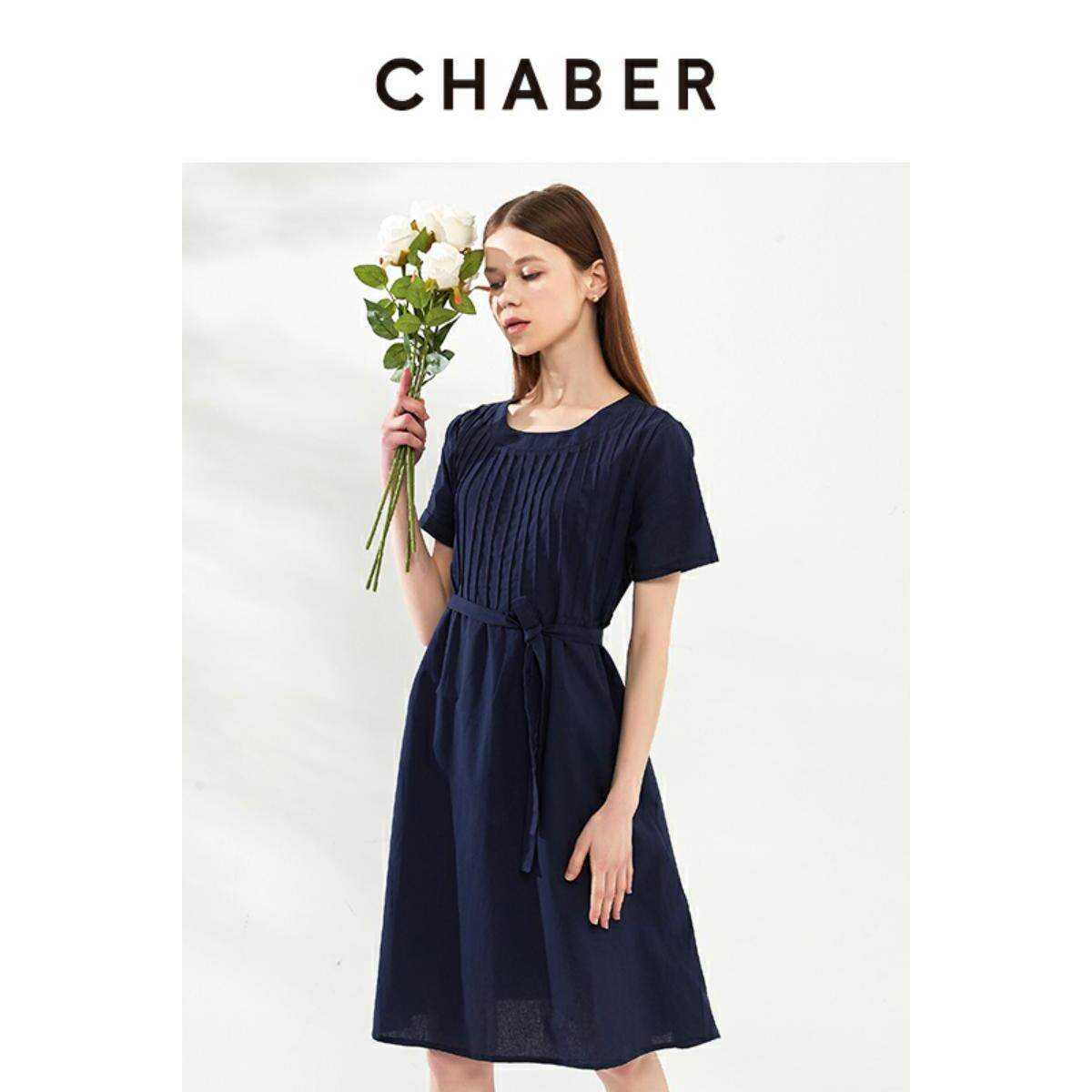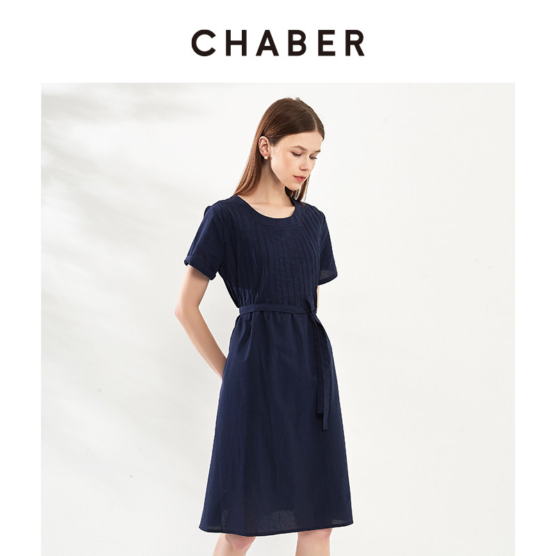 chaber巧帛夏季新款风琴褶皱棉麻优雅时尚系带收腰显瘦圆领连衣裙