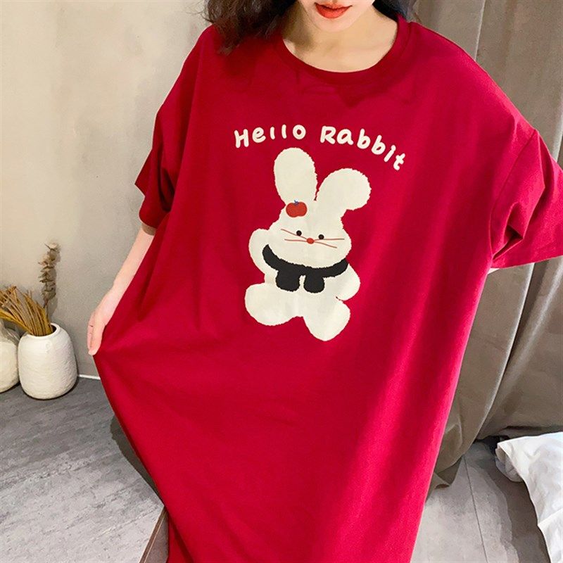 胸垫睡裙夏季短袖纯棉中长款宽松大码休闲孕妇睡裙可外穿可爱睡衣