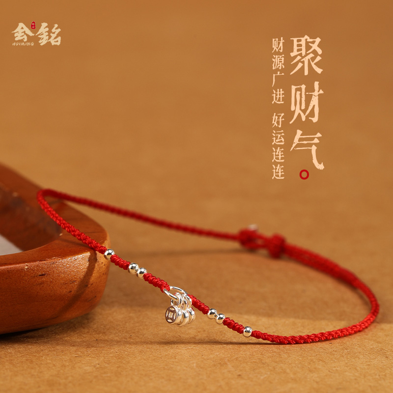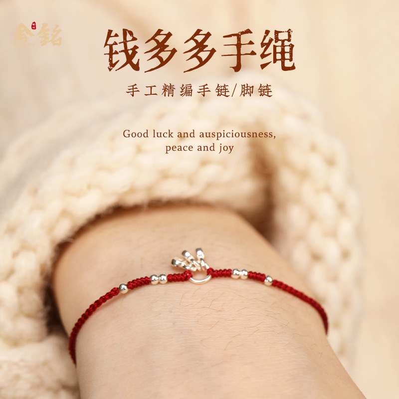 新款925纯银钱多多红绳脚链编织超细本命年好运红脚绳女男手链