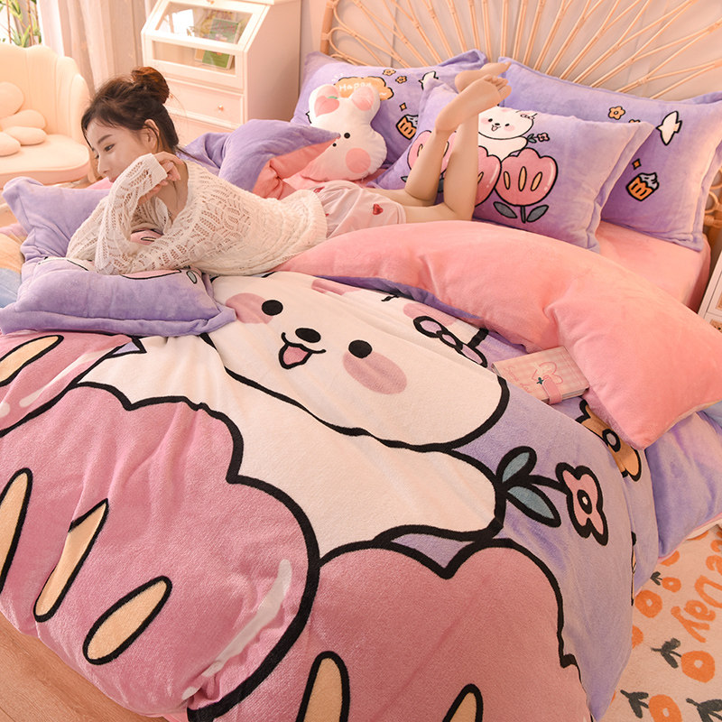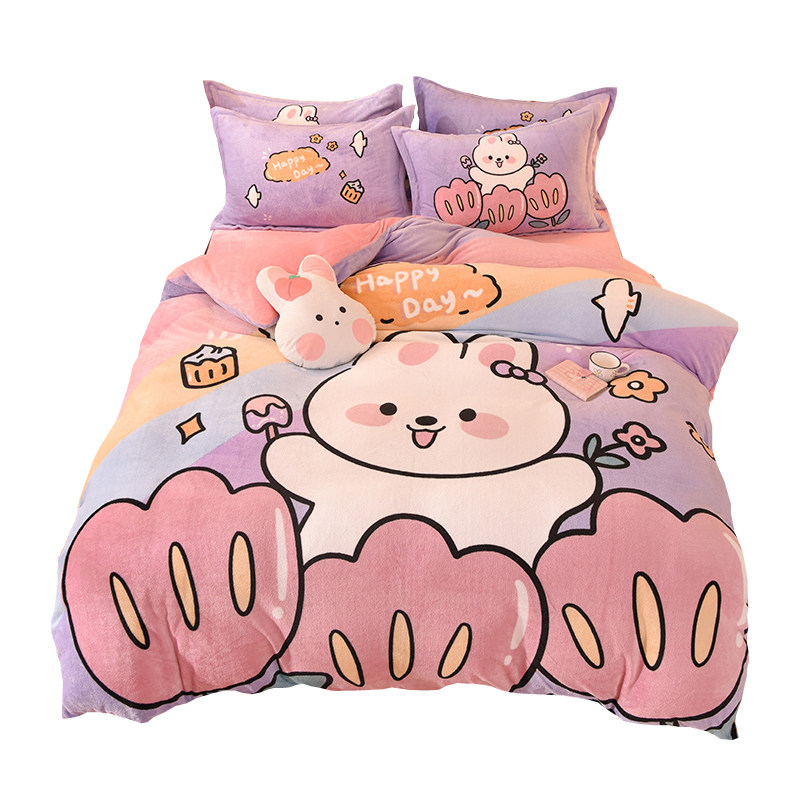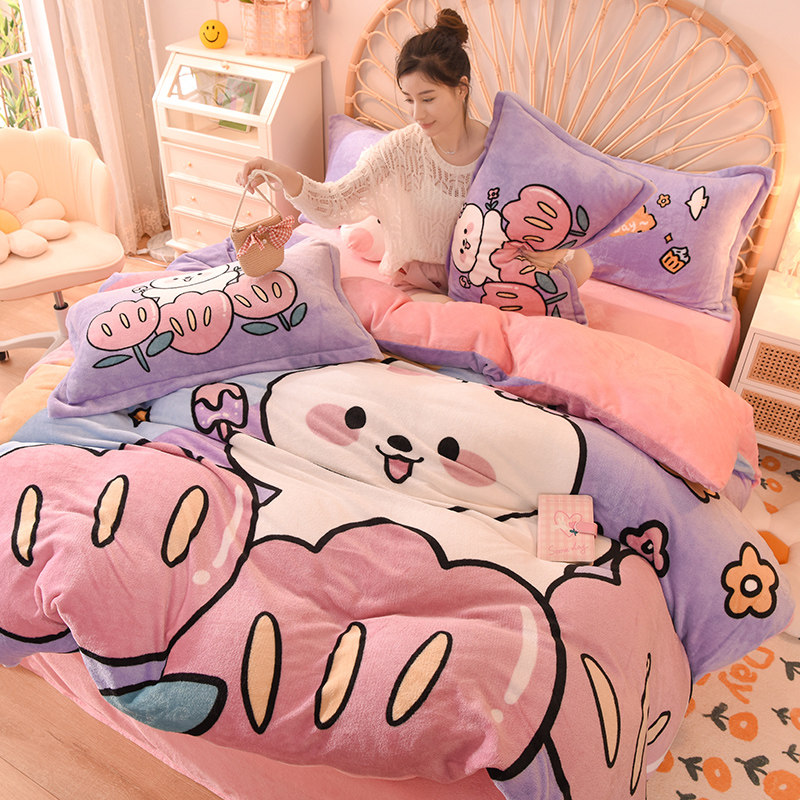 秋冬可爱卡通牛奶绒四件套珊瑚绒被套双面加绒保暖儿童床单三套件