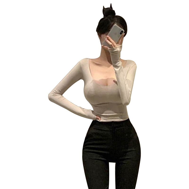 显身材秋季上衣纯欲性感显胸大紧身打底衫弧形下摆短款长袖T恤女