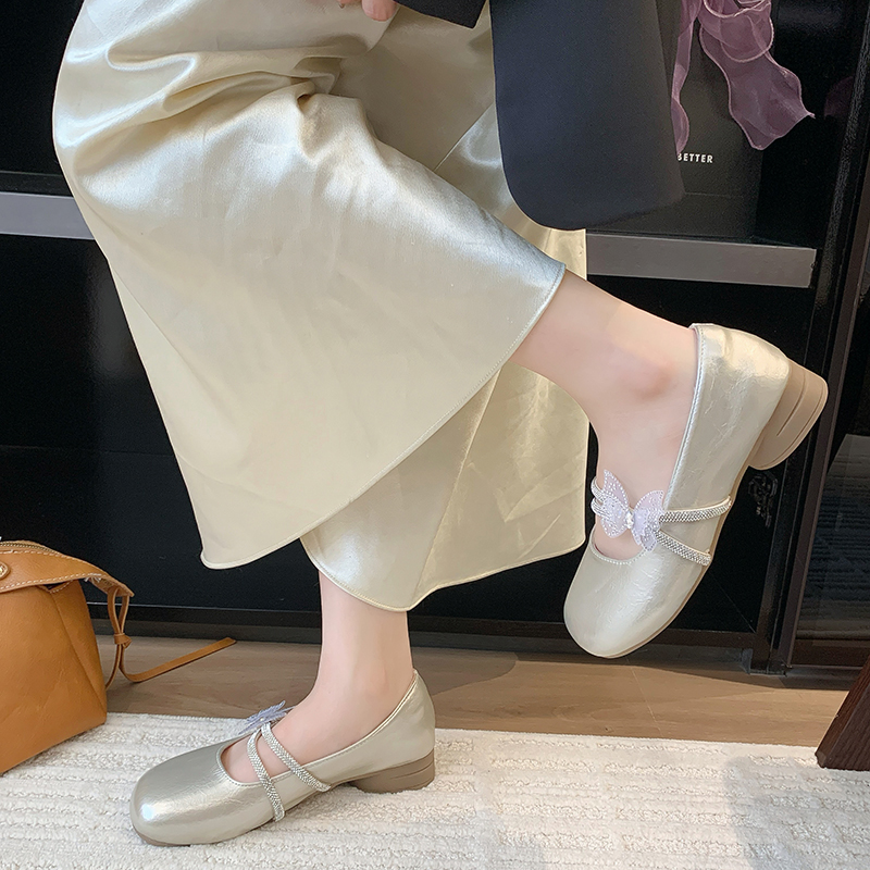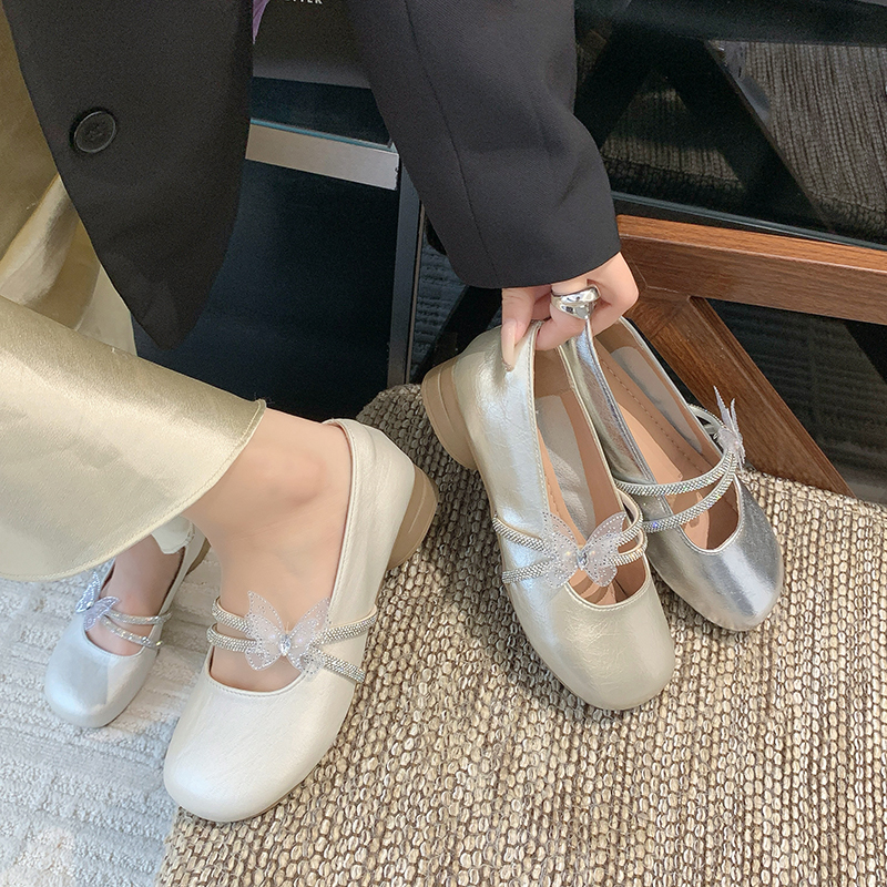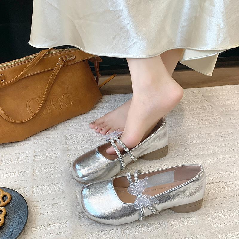 法式银色粗跟玛丽珍鞋女2025新款夏季时尚百搭水钻蝴蝶仙女风单鞋