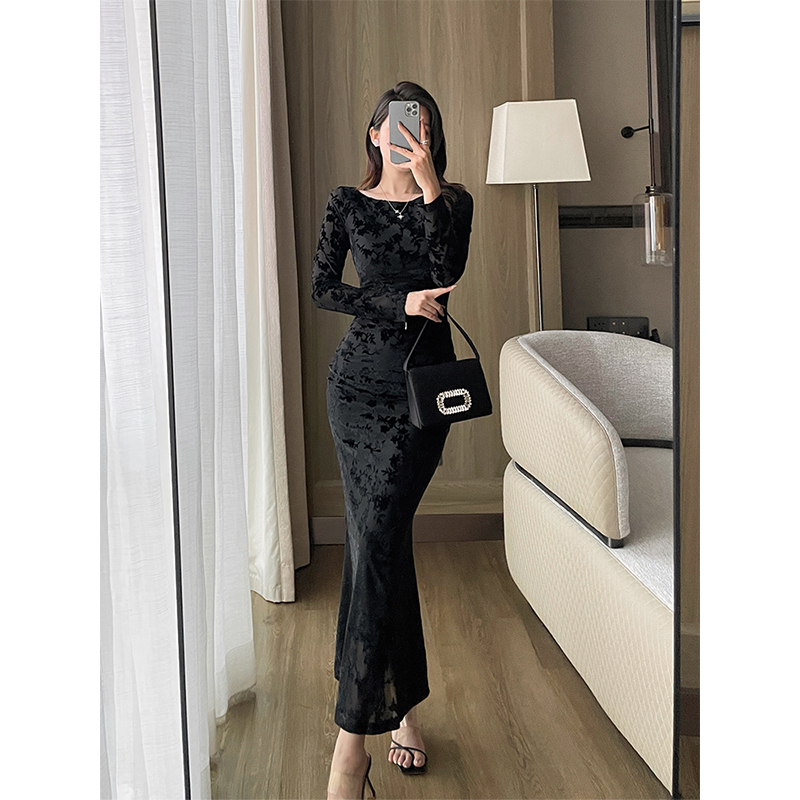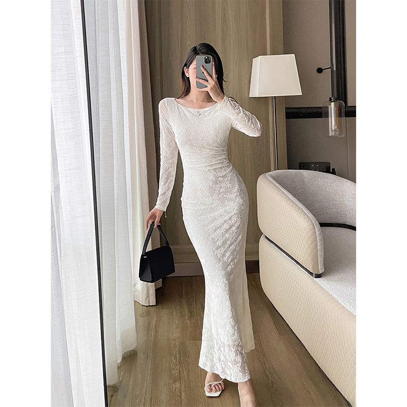 白色赫本长裙女秋季新款高端气质丝绒烧花长袖修身包臀鱼尾连衣裙