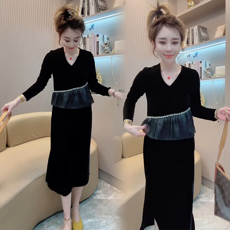 通勤黑色菲菲边镶钻丝绒连衣裙